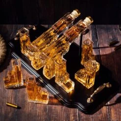 - DRINKING WHISKEY WILL NEVER BE THE SAME: AR15 Gold Gun Decanter & 4 whiskey glasses paired with a wooden display stand. Can you imagine how classy this will look in your bar? This handmade AR15 whiskey decanter gun will start your drinking with a bang. The gun with it’s details is sure to be a wonderful addition to any home bar.