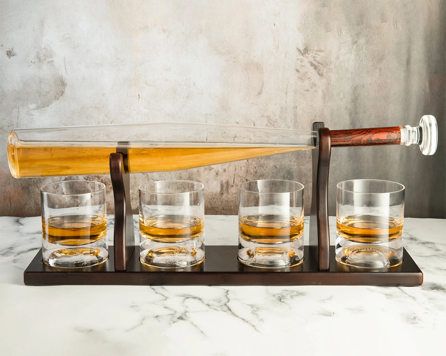 - LIMITED EDITION BASEBALL SET – WITH A BEAUTIFUL MAHOGANY BAT SHAPED HOLDER: This is a limited Edition Large Baseball Decanter Bat and 4 Baseball Whiskey Glasses. The bat and glasses have many intricate parts and is exceptionally unique in design. Baseball Glass. Copyright 2019 Mark Sanders LLC.
