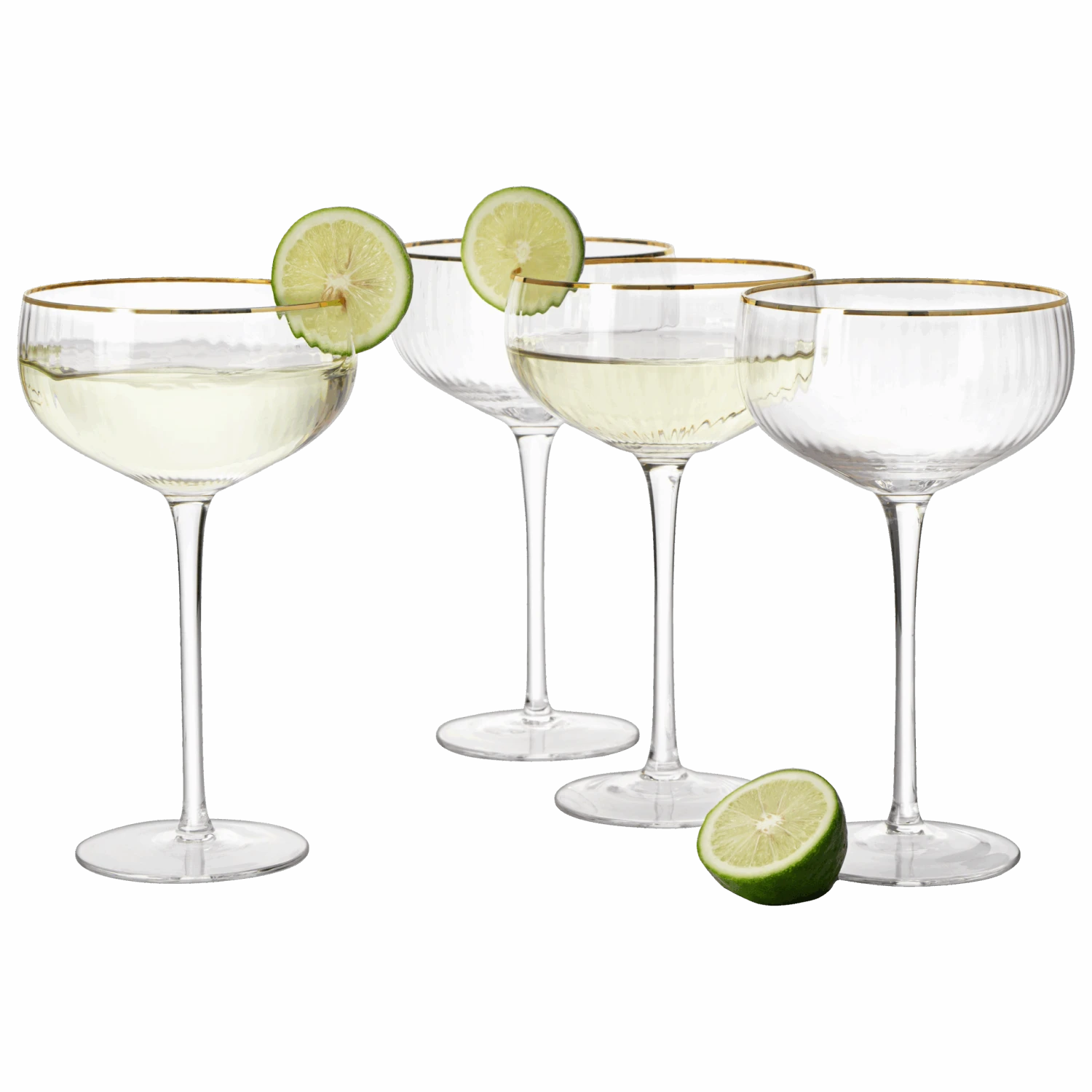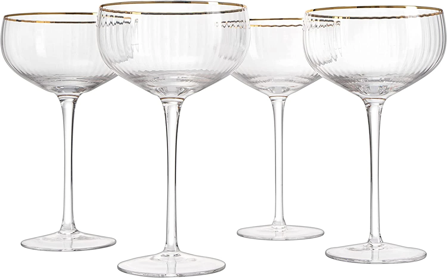 - Add a special touch to your celebration with this set of 4 gold rimmed champagne coupe glasses. The champagne coupe is widely considered to be the most romantic of drinking vessels. So you and your friends are celebrating the special event of a life time. Make it extra special by adding these 4 vintage gold rimmed champagne coupe glasses to the mix! Whether you’re sharing a bottle of champagne, wine or cocktails, these classy glasses are sure to impress your guests.