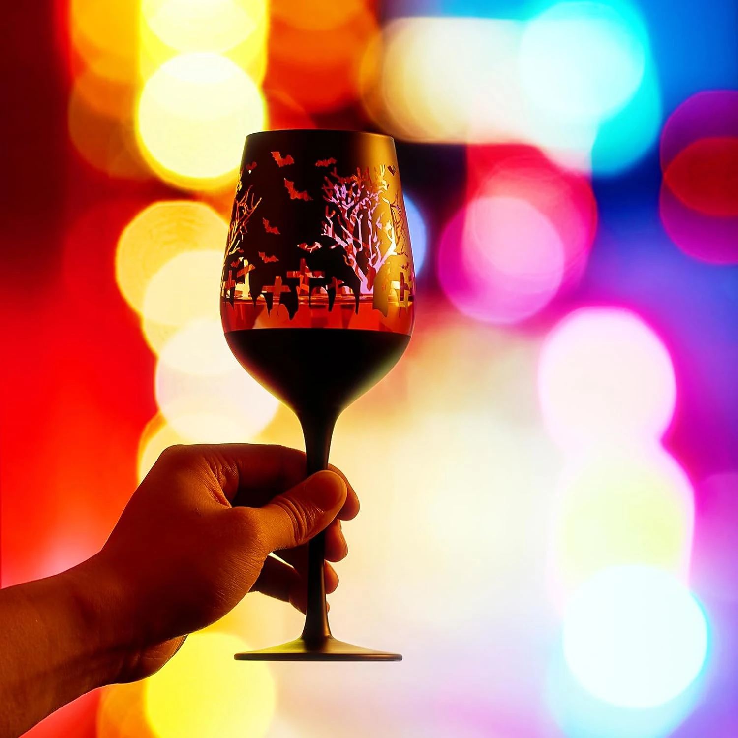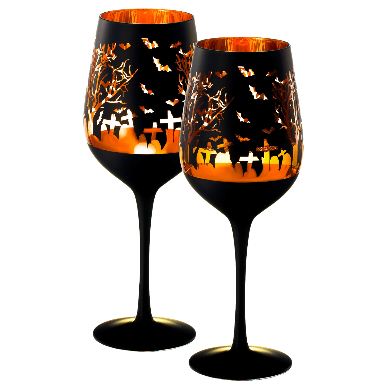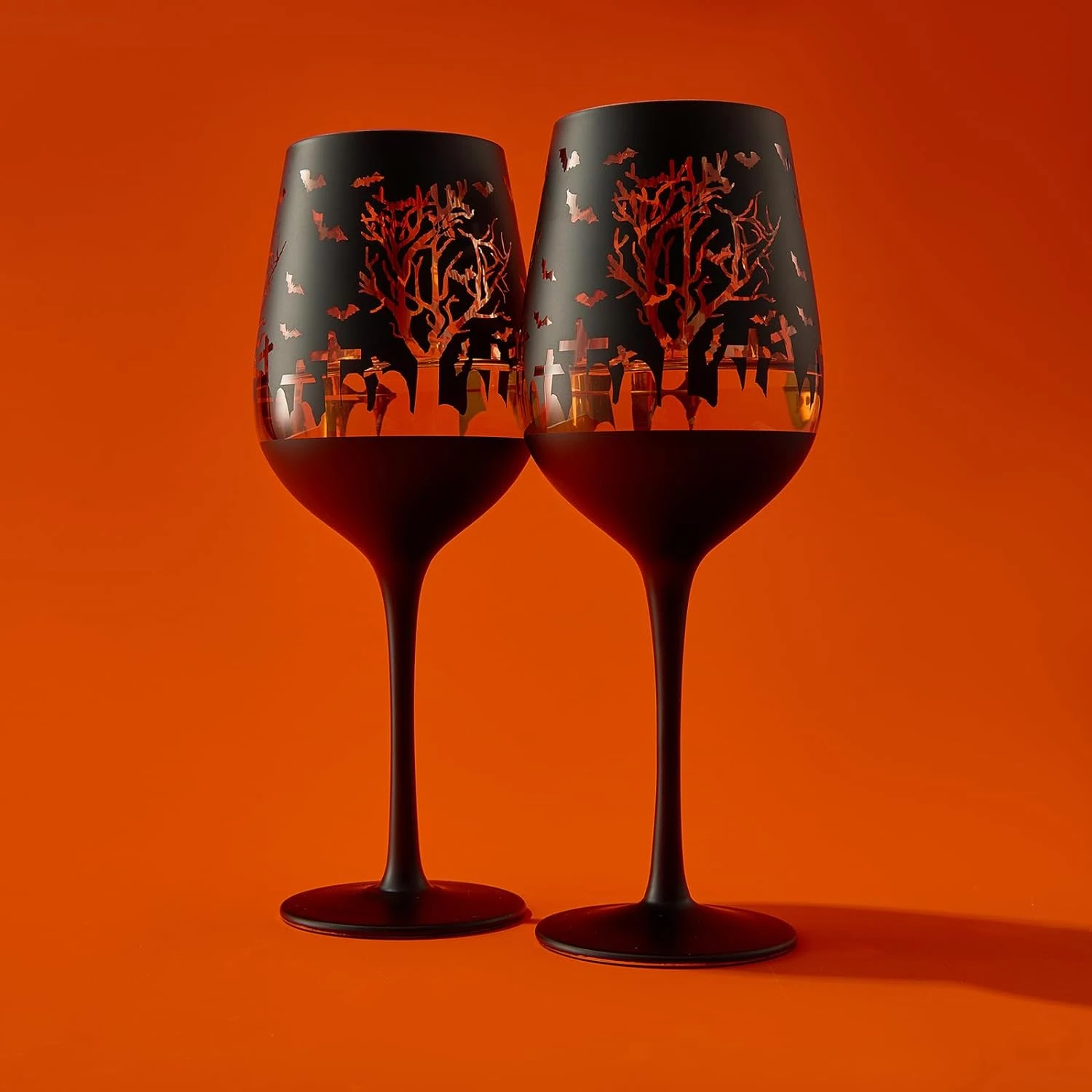 - The Black & Gold Spooky Graveyard Patterned Stemmed Wine Glass showcases a distinctive design with its frosted black exterior and shiny gold interior. Adorned with a graveyard pattern, it’s an apt choice for the impending spooky season and Halloween-themed gatherings.