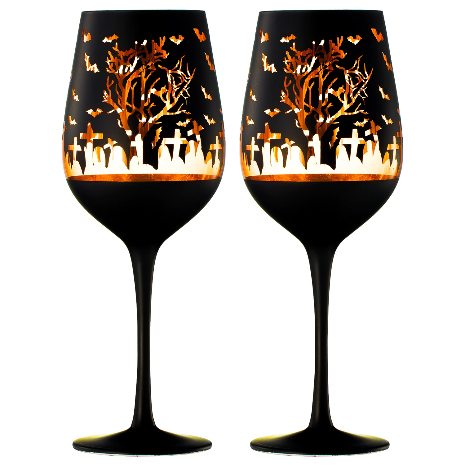 - The Black & Gold Spooky Graveyard Patterned Stemmed Wine Glass combines style and thematic charm through its frosted black exterior, shiny gold interior, and intricate graveyard pattern. With its notable height and functional capacity, this glass is an eye-catching and suitable choice for those aiming to infuse an element of intrigue into their drinkware for the upcoming spooky season and Halloween-themed events.