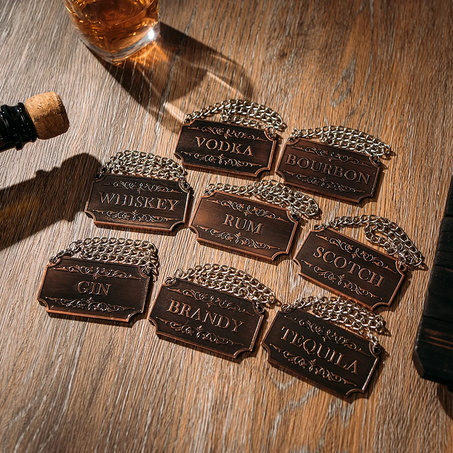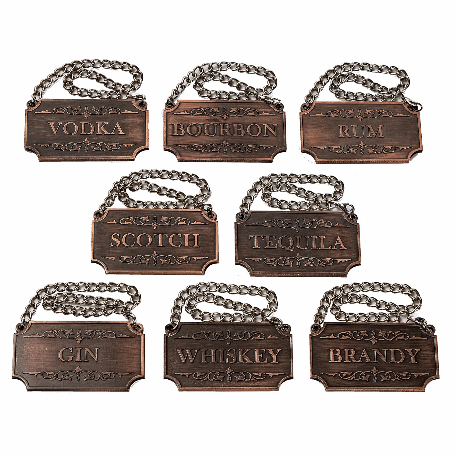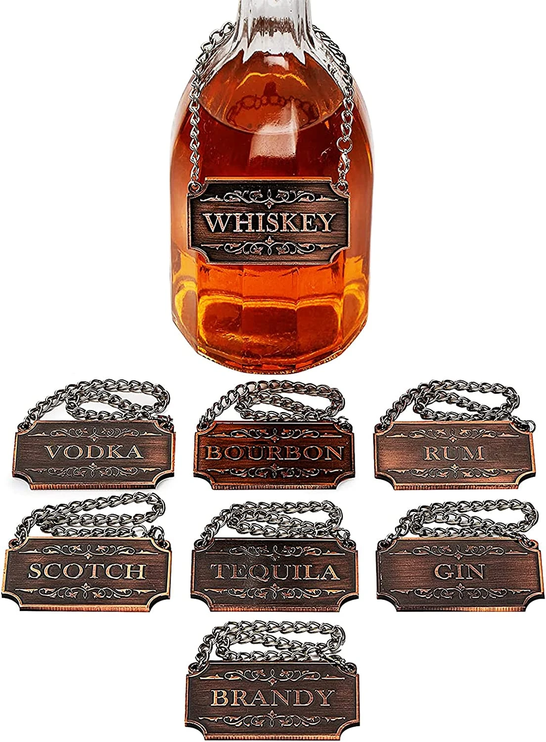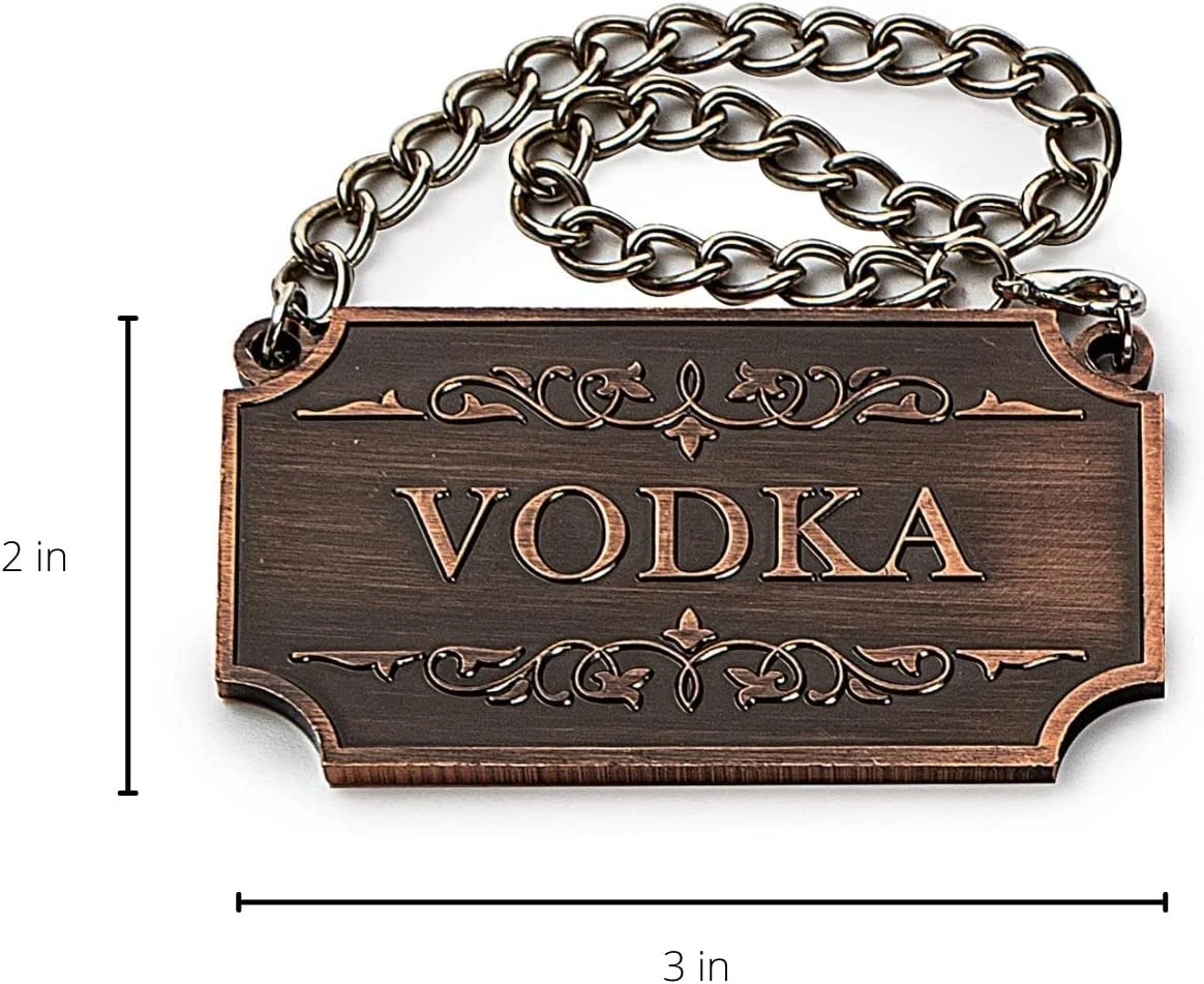 - THE FULL BAR DECOR: The Decanter Tags are simply a must have for anyone that wants to make their drinks more enjoyable and satisfying. It comes with 8 bronze liquor tags including Vodka, Bourbon, Run, Scotch, Tequila, Gin, Whiskey and Brandy. If hosting a party, event or small get-together, these tags will help you organize your liquor in a clear, fashionable way that will leave your guests pleased.