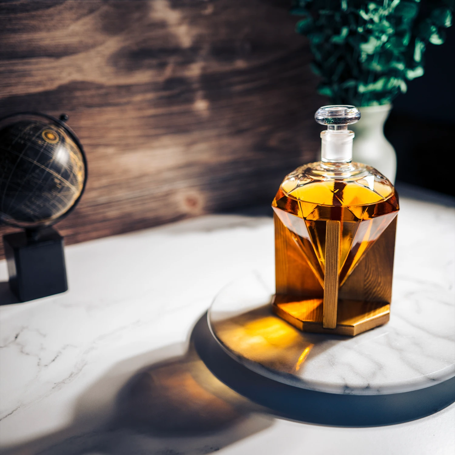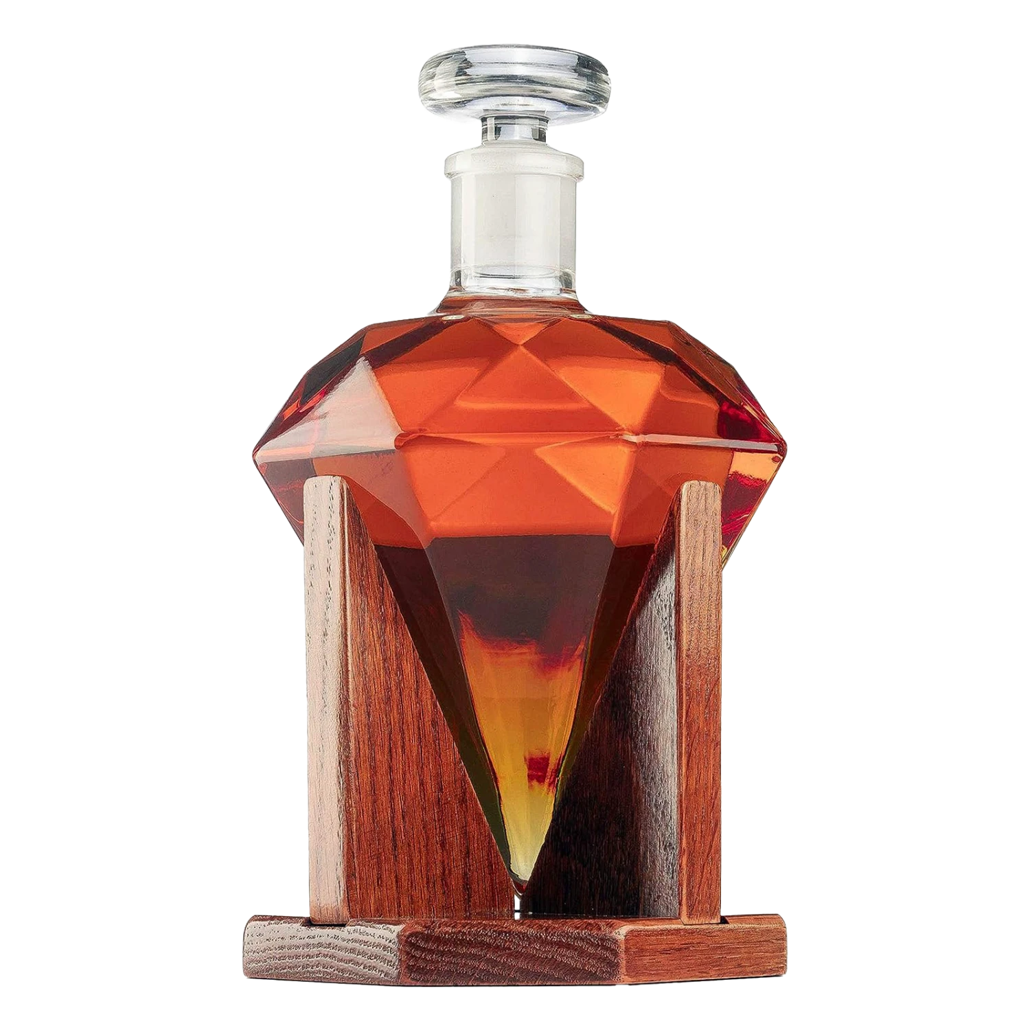 - IMPRESS YOUR BAR SET WITH DIAMOND STYLE WITH THIS LARGE WHISKEY DIAMOND DECANTER:Great as a starter of finishing touch for any bar. This is a hand crafted carefully constructed DIAMOND decanter will make anyone admire the artfully detailed diamond shape spirits decanter, and it’s symmetrical mahogany base 100% lead free