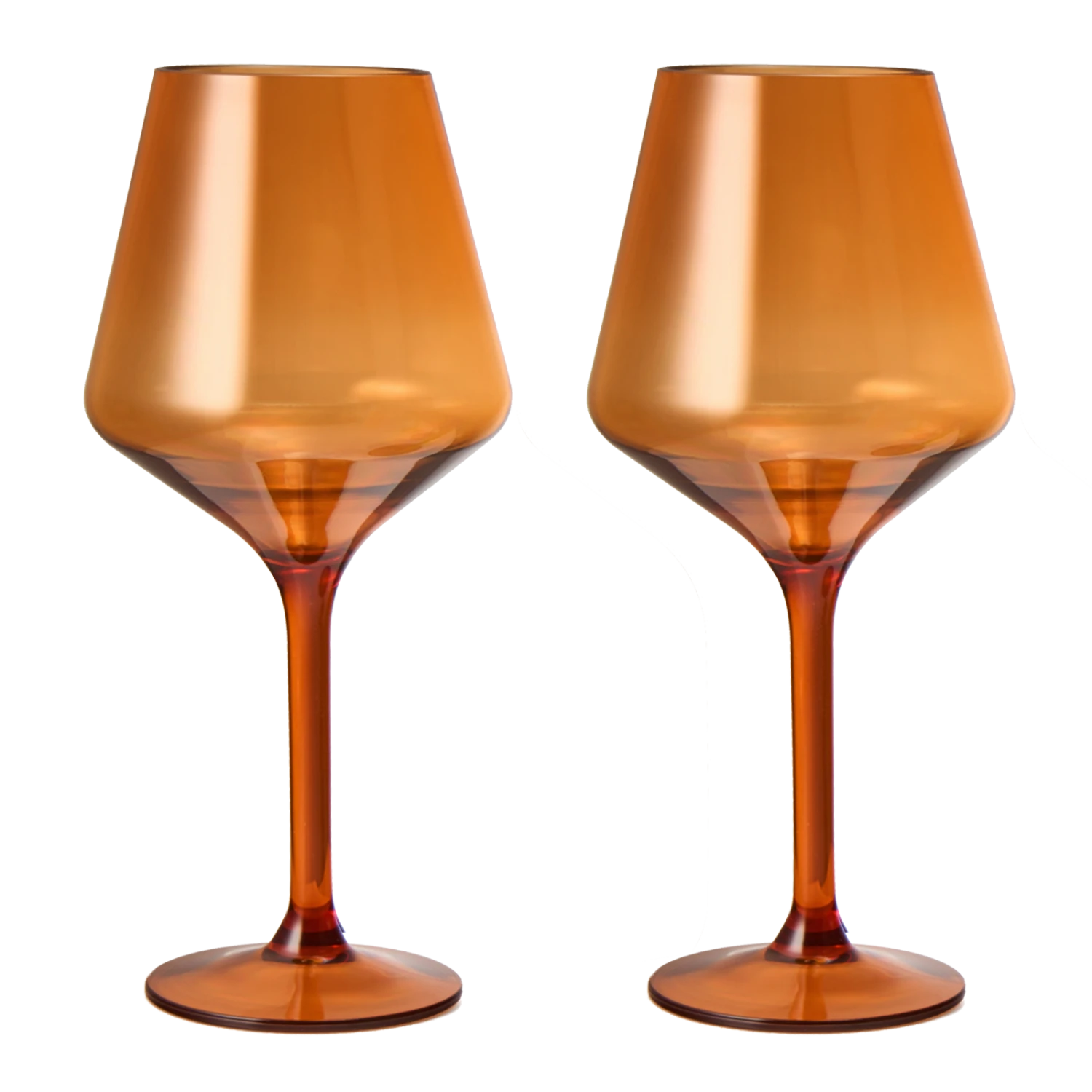 - If you are looking for a stylish and practical way to enjoy your favorite wine outdoors, then the acrylic floating wine glass set with a burnt orange color is an excellent choice. This set includes two 15-ounce wine glasses that can float in water, making them ideal for poolside cocktails, beach days, or boating adventures. They are perfect for the upcoming warm seasons, and they will add a touch of elegance to any outdoor occasion.
