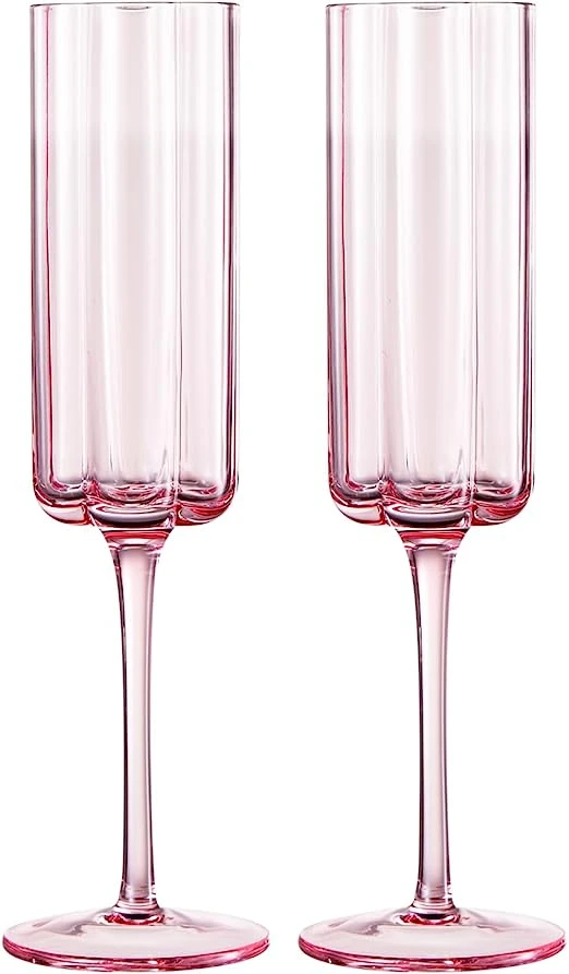 - Each flute in this set is beautifully colored in a vibrant pink shade, adding a touch of playfulness and charm to your table setting. The soft and feminine hue creates a delightful visual contrast against the sparkling bubbles of your favorite champagne. These glasses are sure to capture the attention and admiration of your guests, making them an ideal choice for both casual gatherings and formal events.
