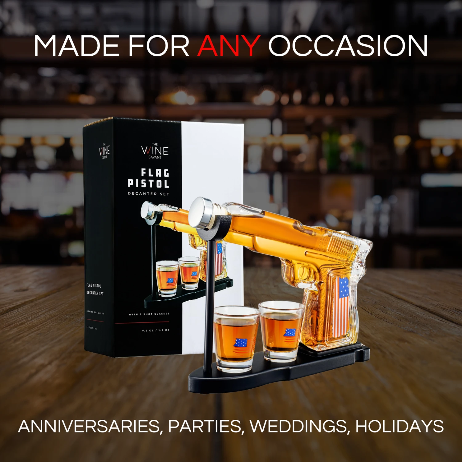 - This decanter set, featuring an 8 oz whiskey dispenser shaped like a classic American flag pistol, is perfect for whiskey enthusiasts who appreciate bold, patriotic designs. Complete with two 2 oz whiskey glasses, this set combines functionality with a striking aesthetic, making it an ideal gift for men who enjoy their spirits in style. Whether it’s for your dad, husband, or a close friend, this decanter set is sure to make a statement in any collection.
