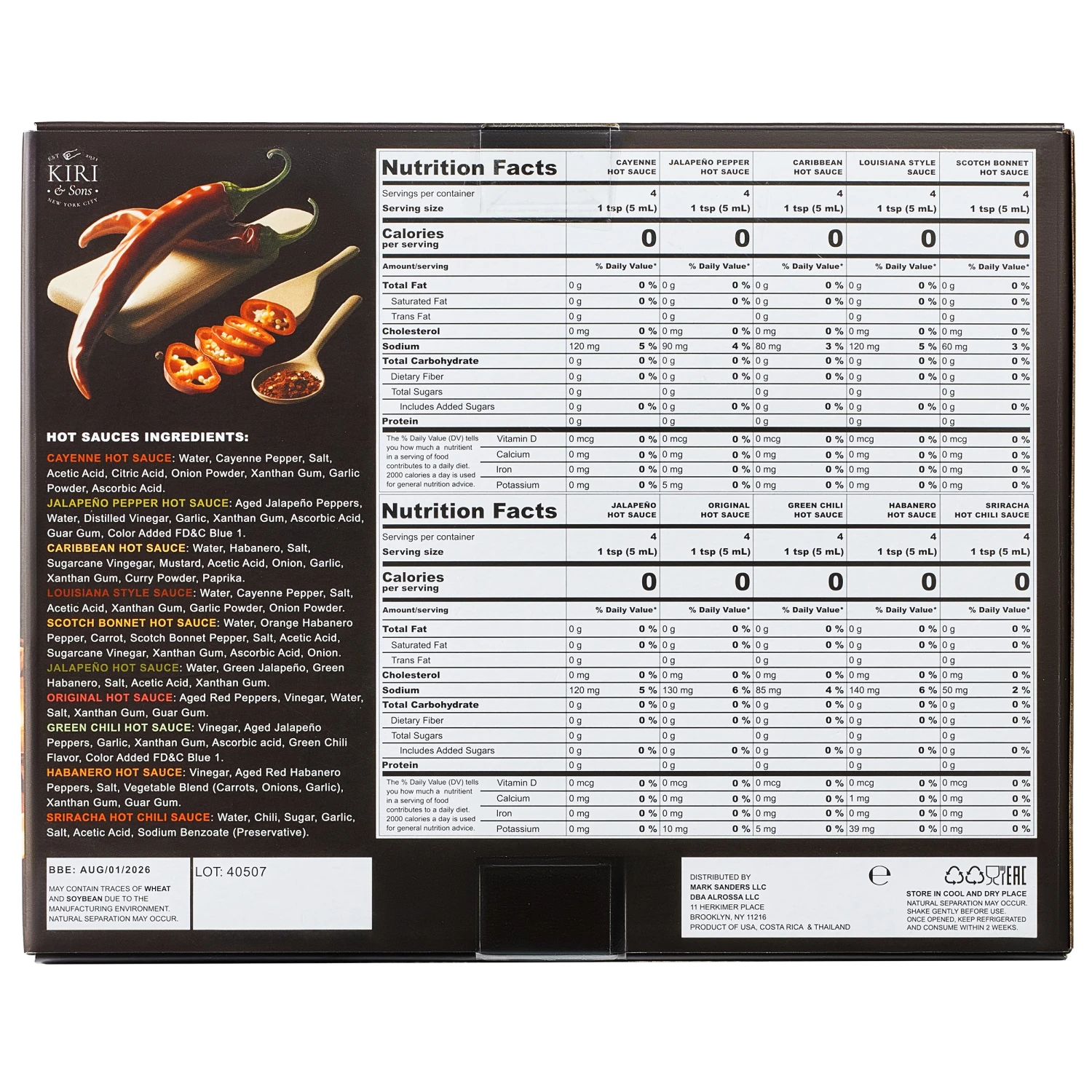 - Introducing the Kiri & Sons Gourmet Hot Sauce Sampler Gift Set of 10, a fiery and flavorful collection designed for hot sauce enthusiasts and culinary adventurers alike. This diverse variety pack offers 10 unique flavors, including Habanero, Scotch Bonnet, Jalapeno, Sriracha, Louisiana Style, Cayenne, Red and Green Chili, and more. Whether you’re a spice lover looking to kick up your meals or seeking the perfect gift for someone who enjoys bold flavors, this hot sauce set delivers a world of heat and taste.