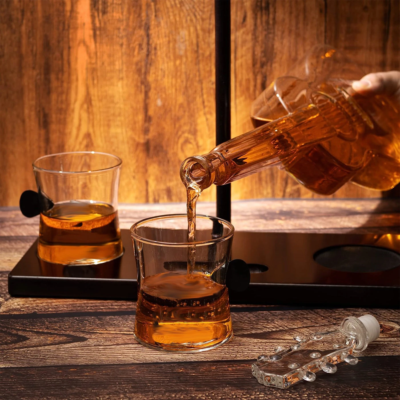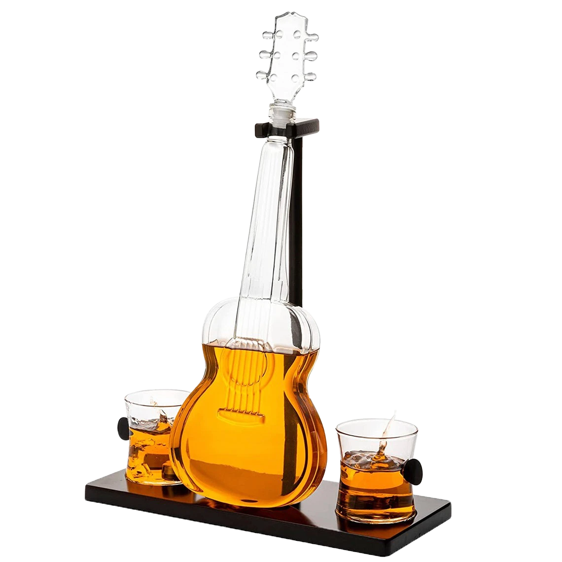 - For music lovers and guitar players, the guitar is the perfect gift to commemorate a performance, or a memorable gig. Our whiskey decanter set will generously allow your guests to sample a variety of liquors in style. Show your love for music and whiskey alike with the Decanter and glasses! A beautiful accessory for any home bar, and a unique design that will make any or guitarist turn their heads. A great gift for any enthusiast or collector of classic guitars!