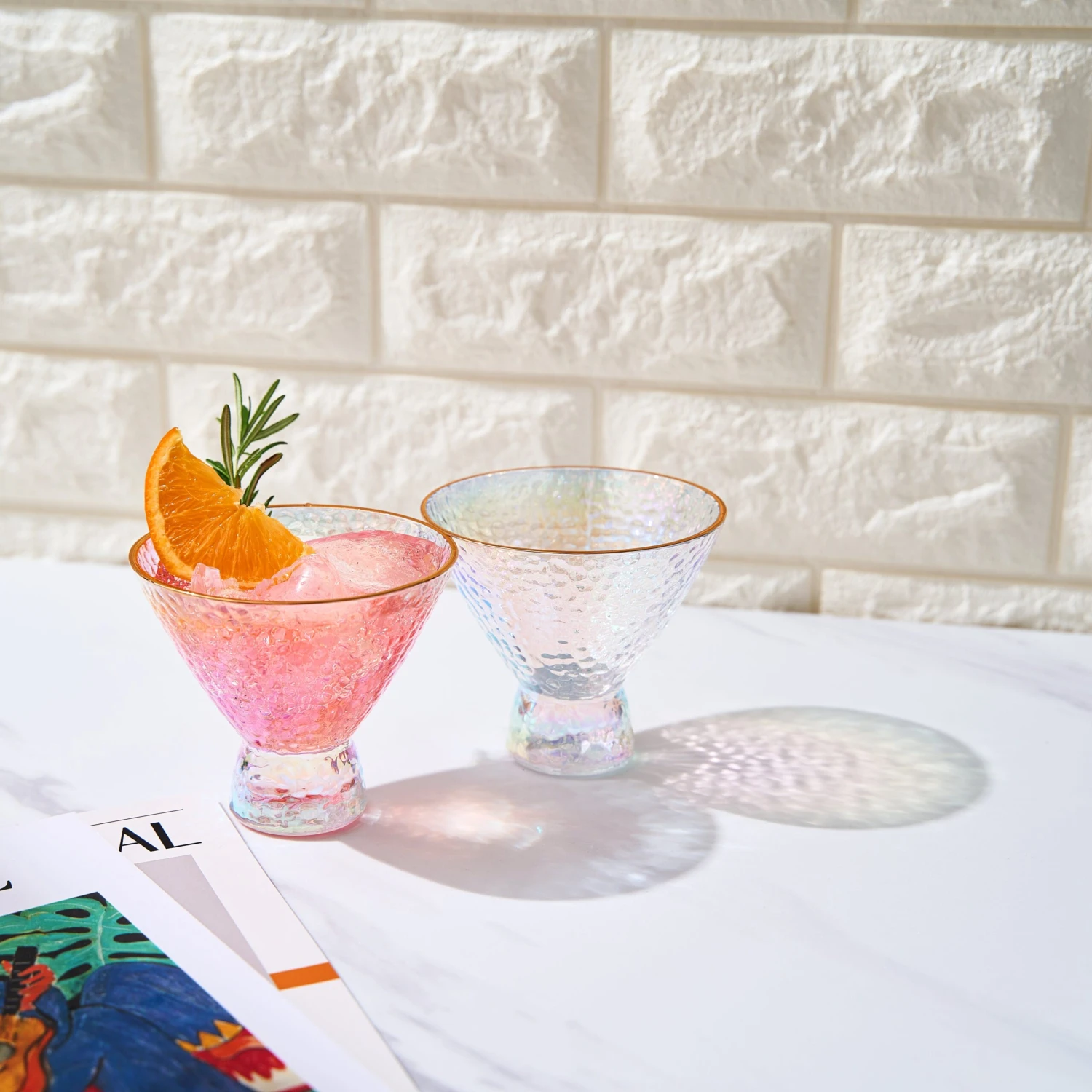 - The Iridescent Hammered Stemless Martini Glass features a captivating iridescent finish that glimmers and shifts colors when touched by light, creating a stunning visual display. The hammered texture adds depth and visual interest, while the delicate gold rim adds a touch of elegance. This combination of unique design elements makes these glasses not only a beautiful choice but also a captivating conversation starter.