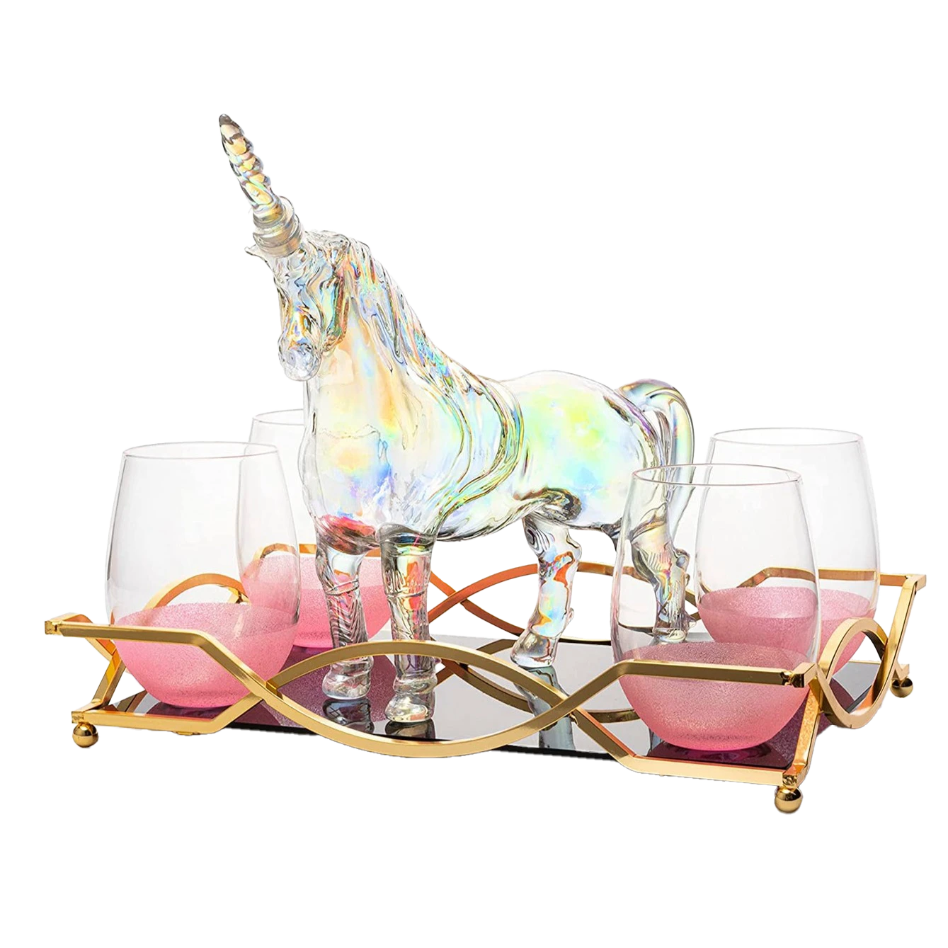 - Turning every day into a party, be entranced by our Unicorn Wine and Whiskey decanter set. Introducing a new way to enjoy Wine or Whiskey with the world’s most magical creature, the unicorn. This exquisite set is nothing less than enchanting. With a black glass base and iridescent decanter, and gold outside, this wine decanter set will capture all the attention and leave your guests in awe. An elegant gift for the wine connoisseur who loves to keep things glamorous.