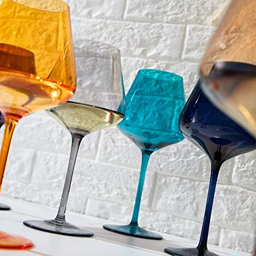 - Sold as a set of 6, the glasses come in a variety of colors inspired by the autumn season. (1) butterscotch, (1) teal, (1) amethyst, (1) amber smoke, (1) rose, & (1) midnight blue. With a capacity of 20 ounces, they are ideal for serving wine, as well as other beverages. Whether you are hosting a small gathering or a large celebration, the spring colored wine glass set is the perfect choice.