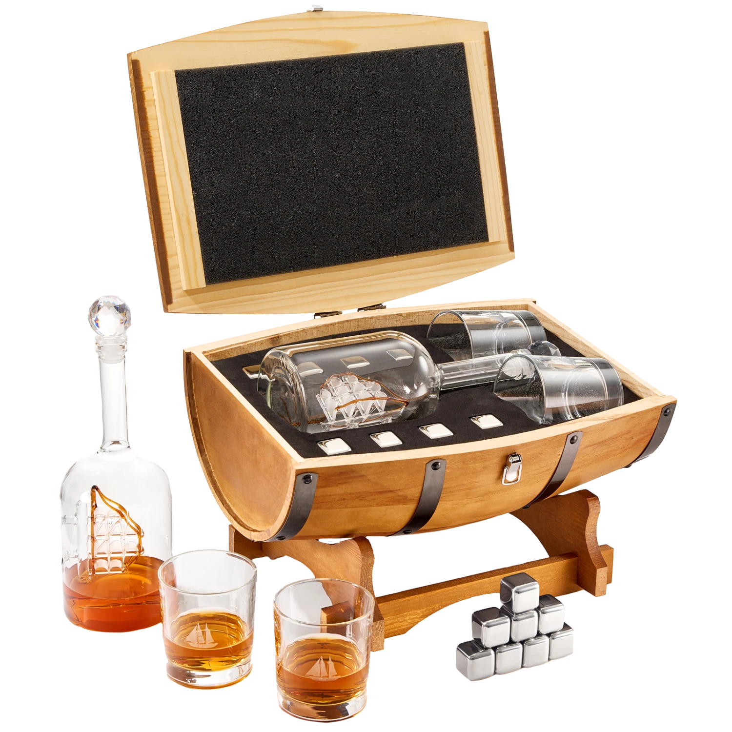 - SAIL CLASSICALLY INTO THE HIGH SEAS: Sail the seas and drink your spirits with this whiskey decanter, this Beautiful Whiskey Ship in a Barrel Decanter is a novelty for any table or bar. Every bar and whiskey connoisseur should have this impressive display decanter and glasses. This Ship in a Barrel decanter set with ship glasses and whiskey chillers is a must-have for the adventurer or the true connoisseur.