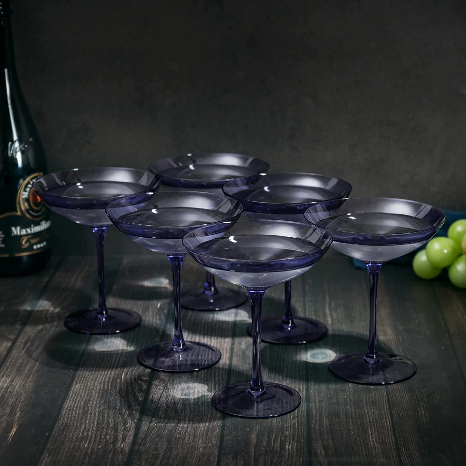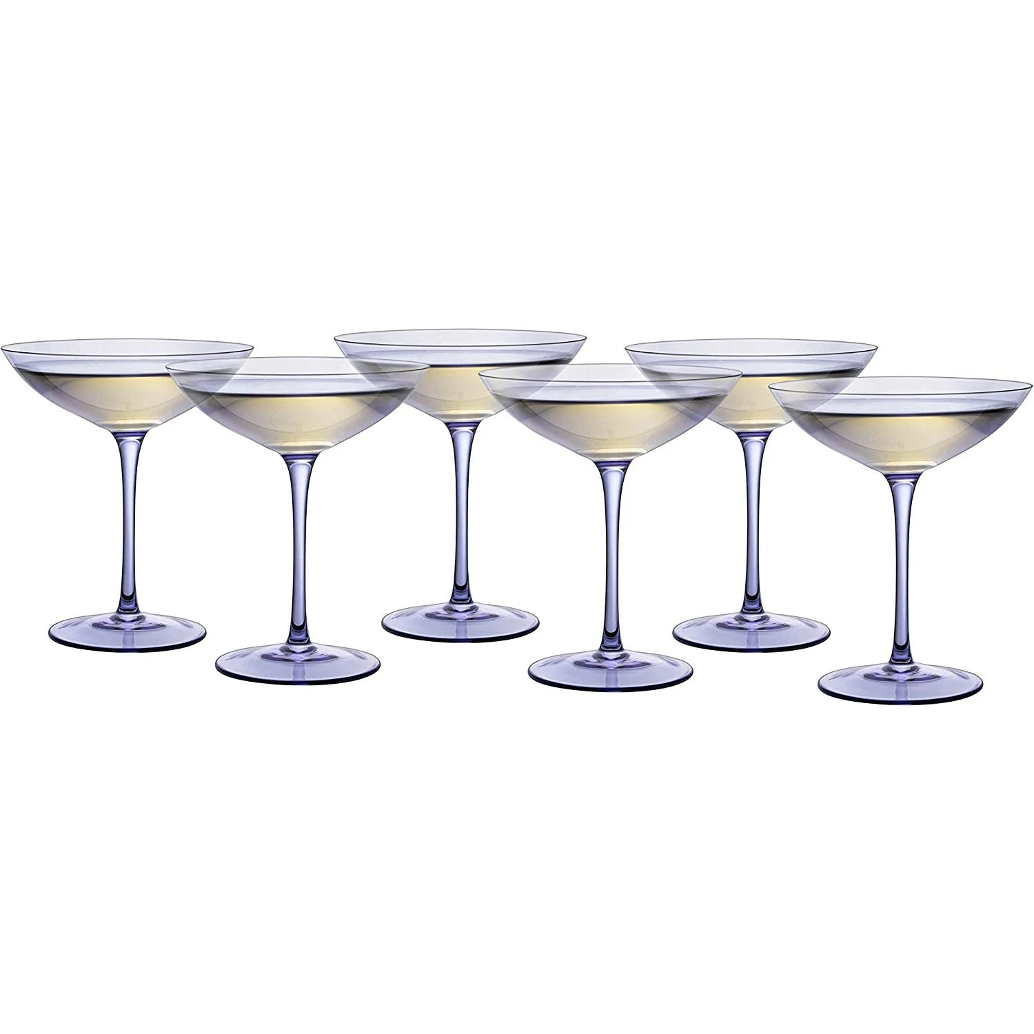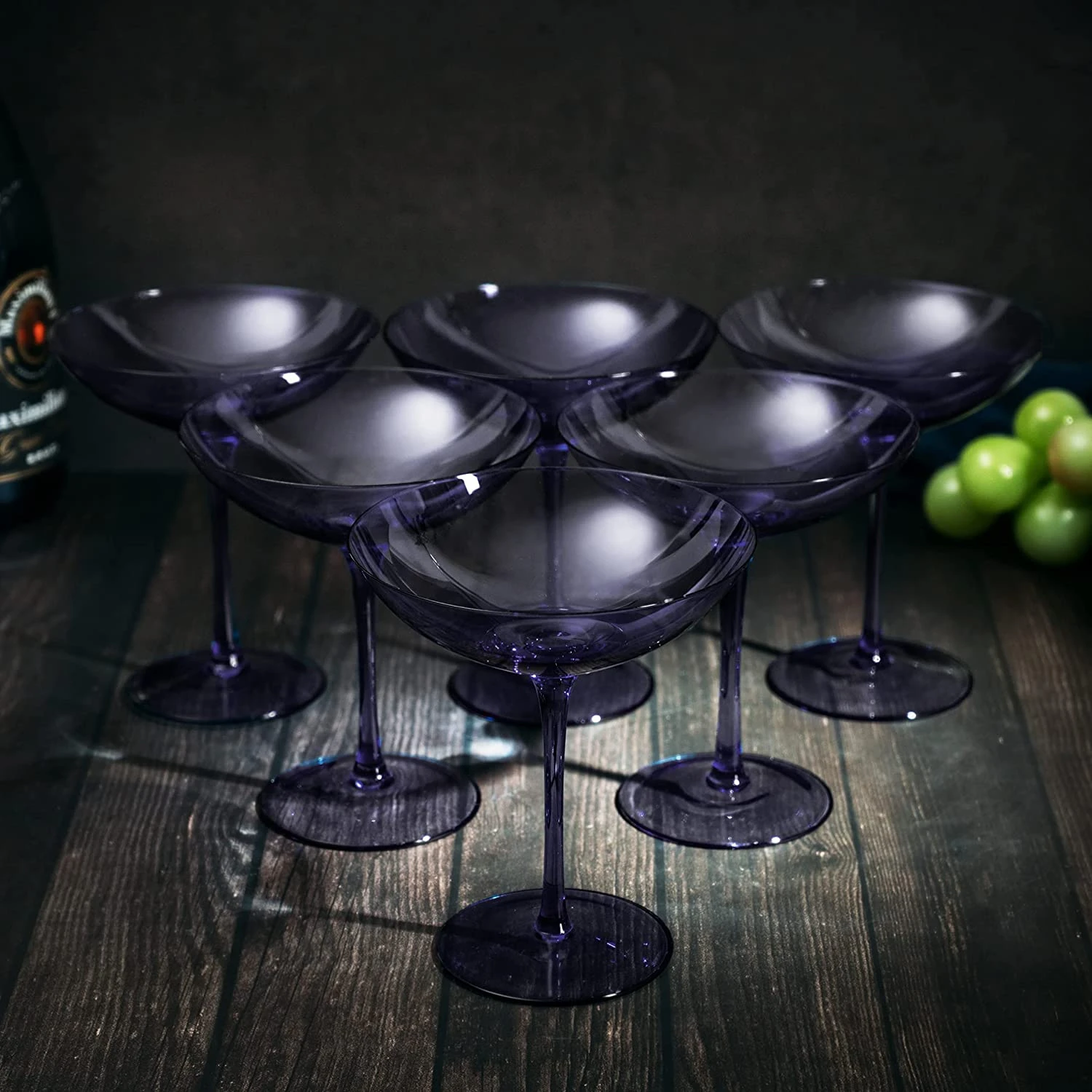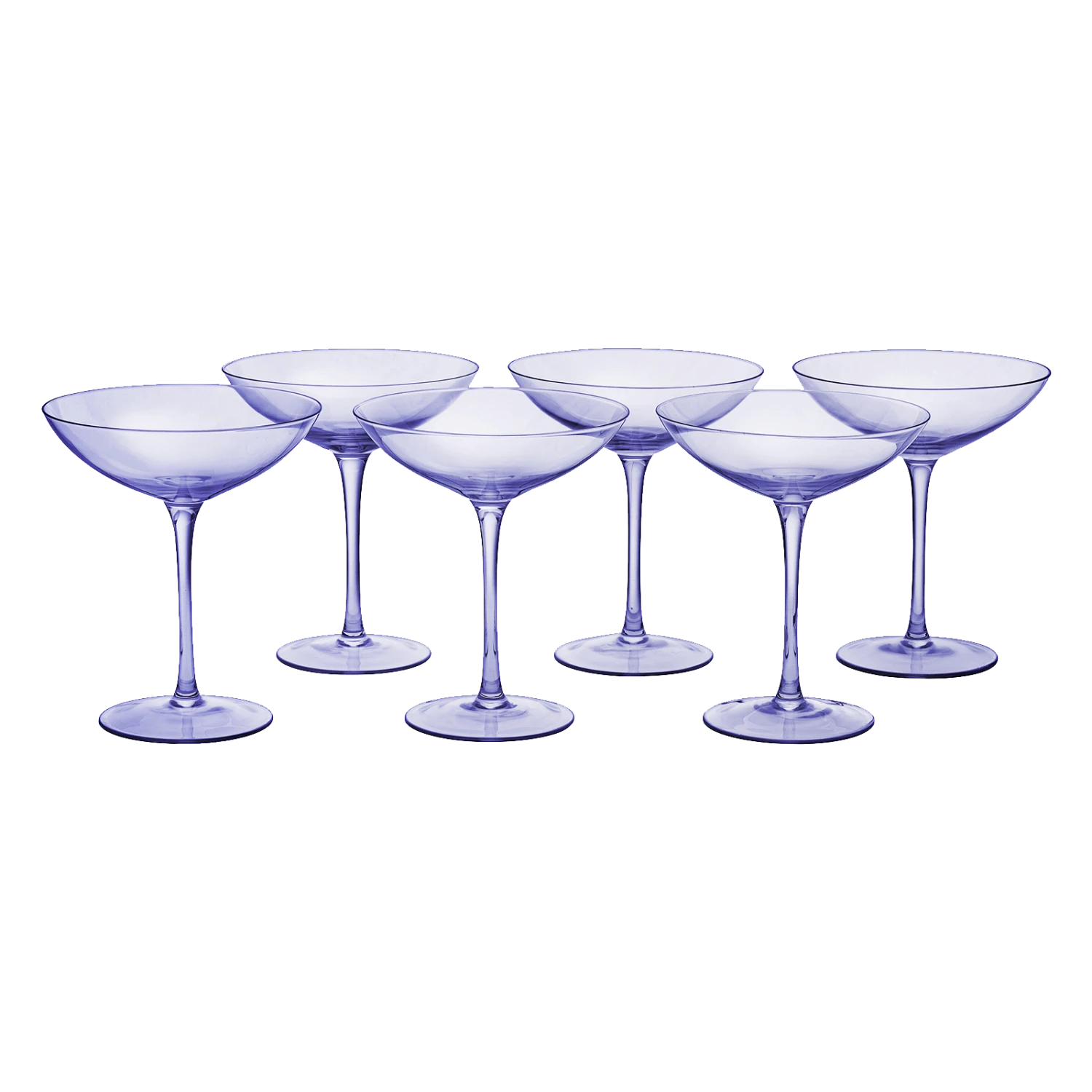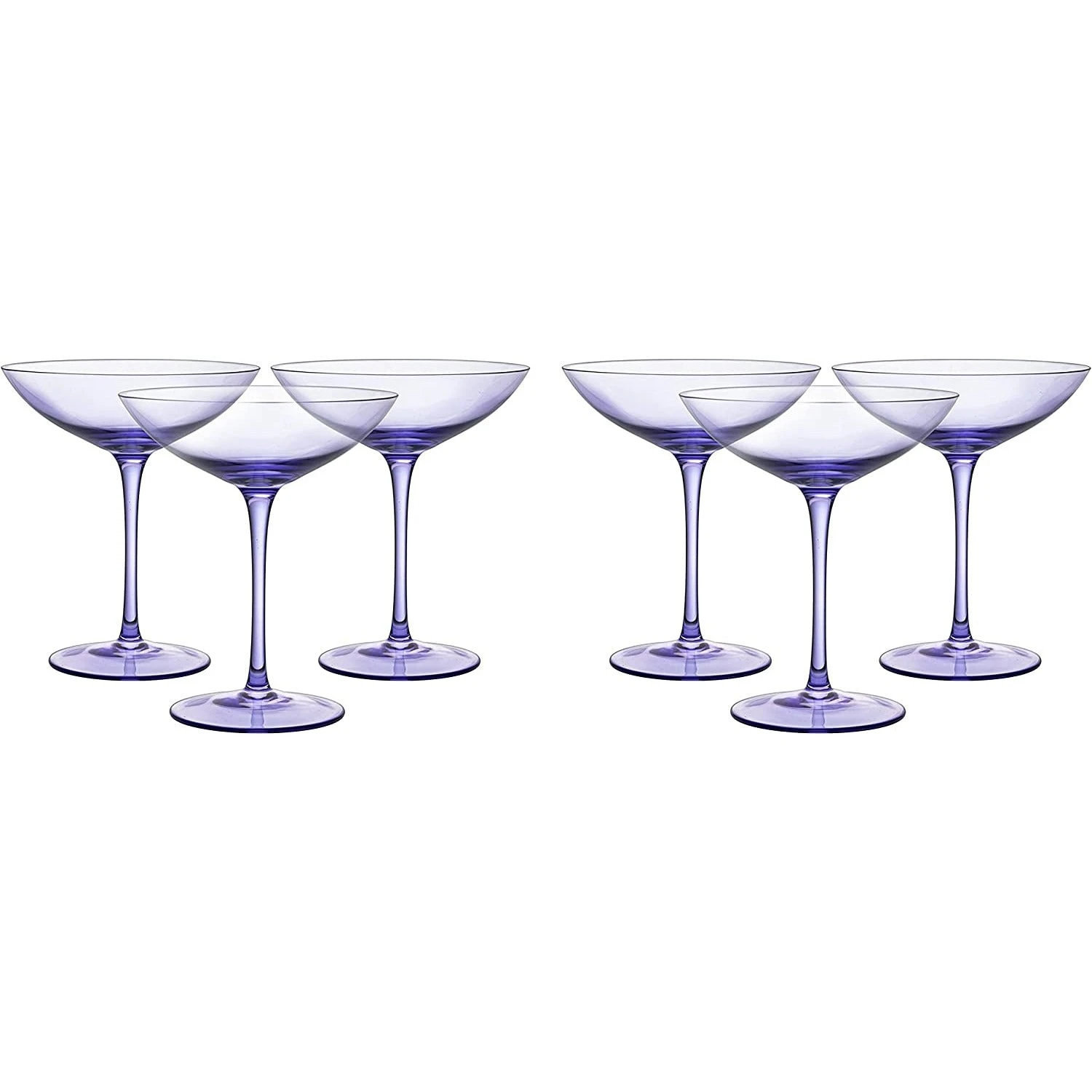 - A must have for any party, the Lavender champagne coupe set of 6 is a great addition to your bar. The classic 12 oz lavender purple design unique color allows this set to be used for any type of drink: cocktail, mimosa, and even prosecco. These glasses look great on the table when you serve guests in the dining room or even on the bar! Makes a great gift for the host or hostess and is perfect for serving wine, prosecco and other bubbly drinks at your next party!