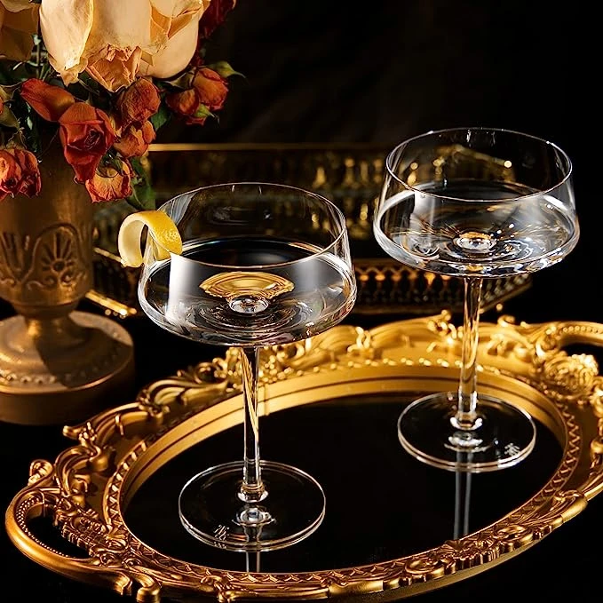 - The glasses’ unique and elegant design, combined with the silver spoon, sets them apart from other glassware collections. The coupes hold 8 ounces of liquid, making them perfect for cocktails and martinis. They are perfect for any special occasion and make an excellent gift for the ultimate hostess. They are not only stylish but also practical, ensuring that they will be enjoyed for years to come. H:6.2″x Dia.: 3.7″