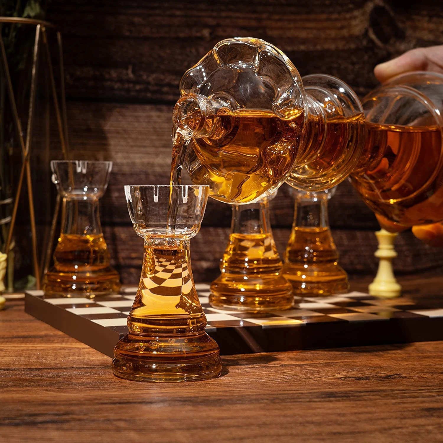 - Chess is one of the most formidable games of strategy ever invented. This cleverly crafted wine and whiskey decanter set matches your grandmaster’s play flawlessly. We have combined all of our love for fine chess playing and a little wine into the perfect decanter to elevate your wine drinking experience. Your friends will be impressed with one of these stylish decanters, displaying an elegant chess board adorned by 4 rook shot glasses and the elegant queen decanter!