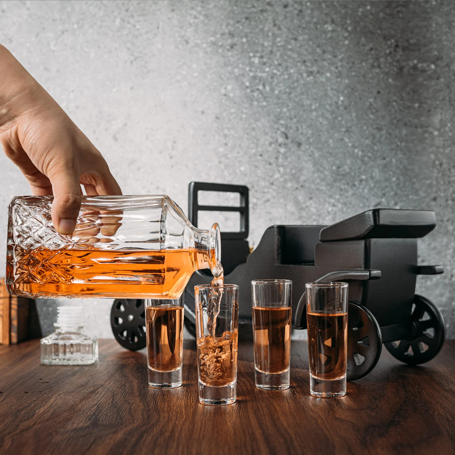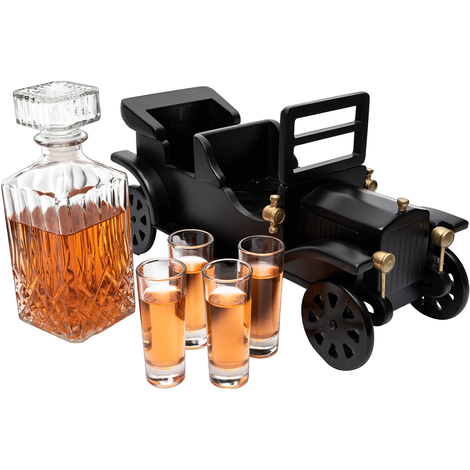 - Let this Model T Car Shot Glasses, serves you stylishly, as it holds up to 3 ounces of your favorite liquid libation. Pour a shot, then enjoy as your favorite whiskey glides from the cavernous decanter down to the pristine bullet glasses within. Spiral down the historic highway with this decanter set that is designed to resemble a long-lasting ride in style. Whether you’re starting an office collection of decanters or want to add something special