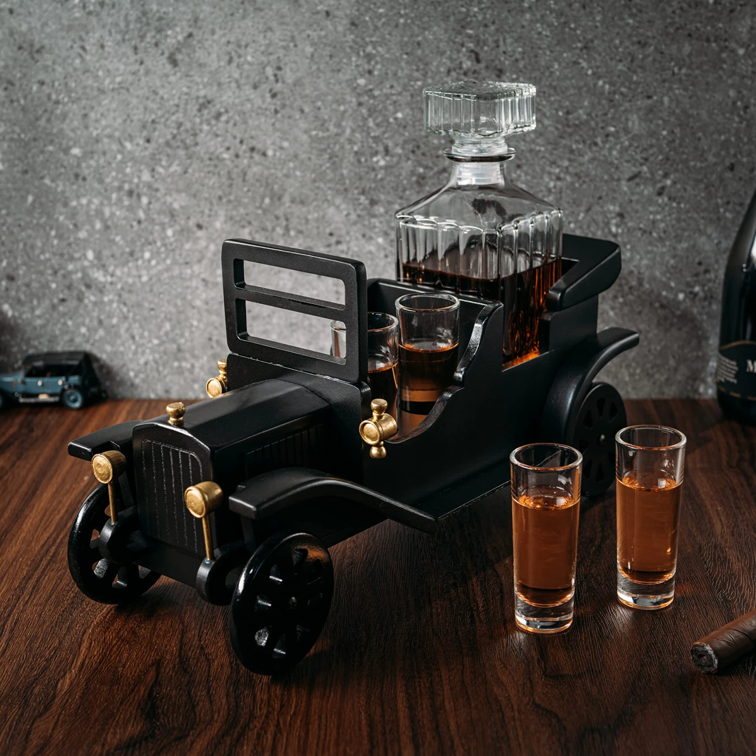 - Up for a quick getaway? Then let this car decanter take the wheel with this Whiskey Model T Car Decanter by The Wine Savant. Complete with a detachable Whiskey decanter, this piece of liquor serving is the perfect companion for a night out on the town or a short jaunt across the country. Bonnie and Clyde may have something to teach you about vehicle decanters. Basically, our whiskey decanter was inspired by their exploits as a couple. A superb wooden car design adorned by an exquisite decanter.