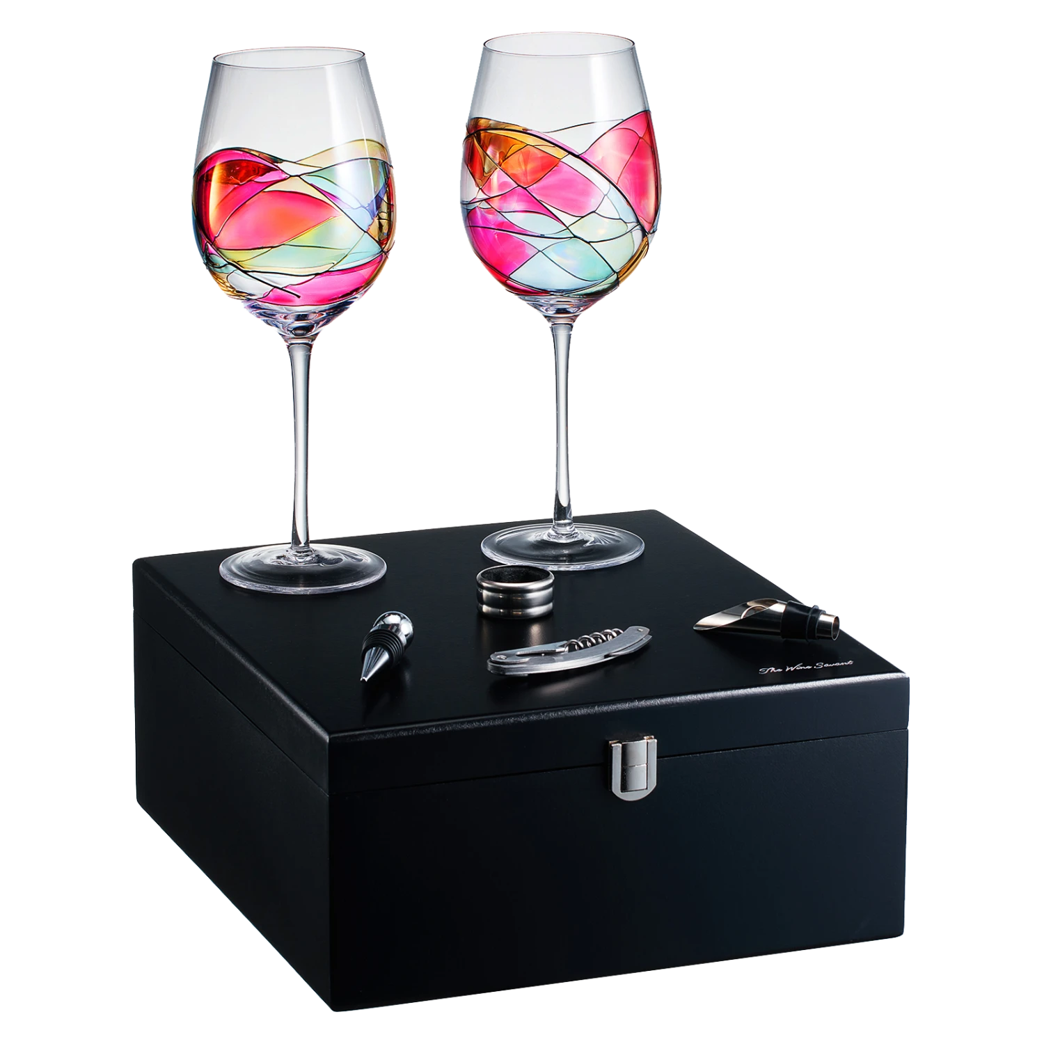 Painted STEMMED Wine Glass Box Set – Opener, Stopper, Drip Ring, Wine Pourer – 2 Glasses