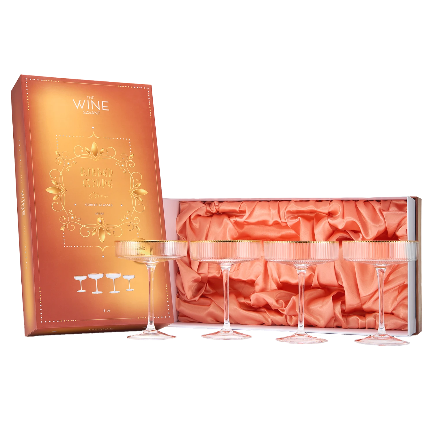 - Celebrate your favorite guests in style with the charmingly elegant Cocktail Coupe Goblet Glasses Set of 4. Whether you’d rather drink or just enjoy the sight of fresh squeezed juices or champagnes floating in the glass, the Coupe Goblet Glasses set is sure to impress. The ripple texture emphasizes the beauty of the glass and makes an impactful impression. This is the perfect gift to yourself. This set of four glasses will be your favorite housewarming gift, or wedding gift.