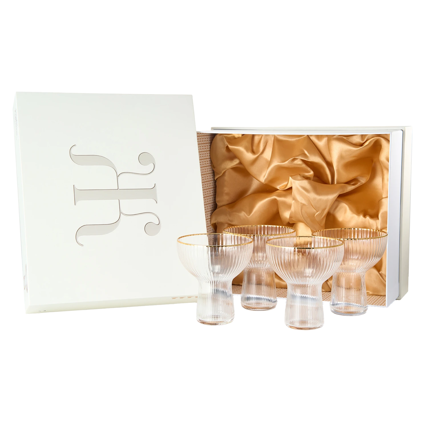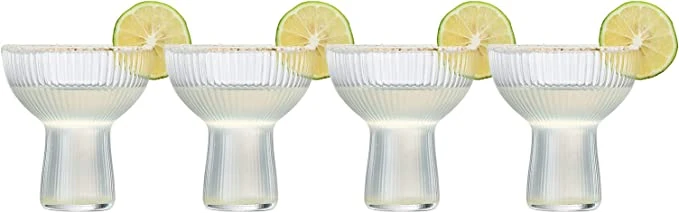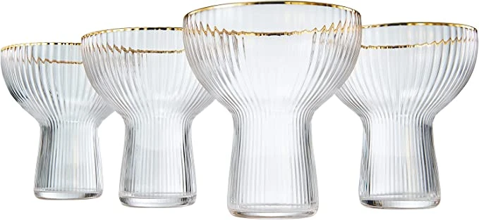 - The Ribbed Stemless Margarita Glassware with a Gold Rim is a stunning and practical collection that any cocktail lover would adore. Sold as a set of four, each glass is a twist on the traditional cocktail and margarita glass. The glasses have a unique and elegant design that sets them apart from other glassware collections. The coupes hold 10 ounces of liquid, making them perfect for margaritas and other cocktails.