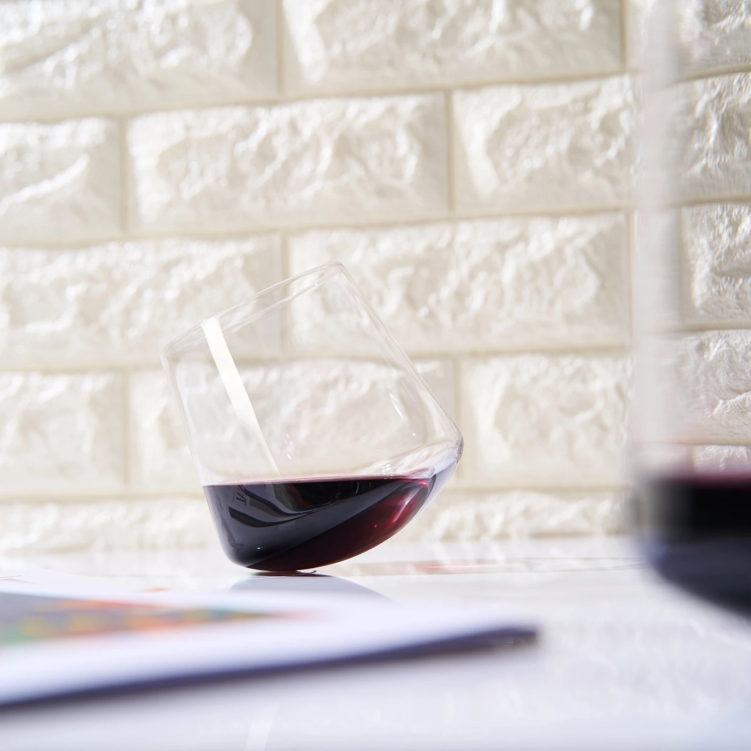 - Crafted with precision and attention to detail, these wine glasses feature a unique design that sets them apart from traditional glassware. The titled bottoms of the glasses act as stabilizers, ensuring that they will never fall over and spill, even on uneven surfaces. This innovative feature not only brings peace of mind but also adds a touch of intrigue to your drinking experience.