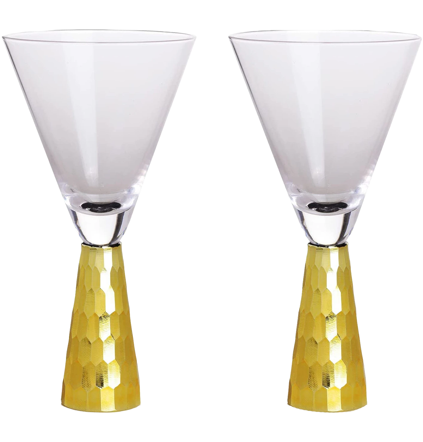 - Enjoy your spirits with vintage flair using these elegant martini glasses. The gold geometric stem’s are eye catching, and make for iconic lineage. The extra-long stem creates a dramatic effect, while the delicately flared shape holds your choice of drink. Perfect for entertaining, these glasses are perfect for serving up your favorite cocktails.