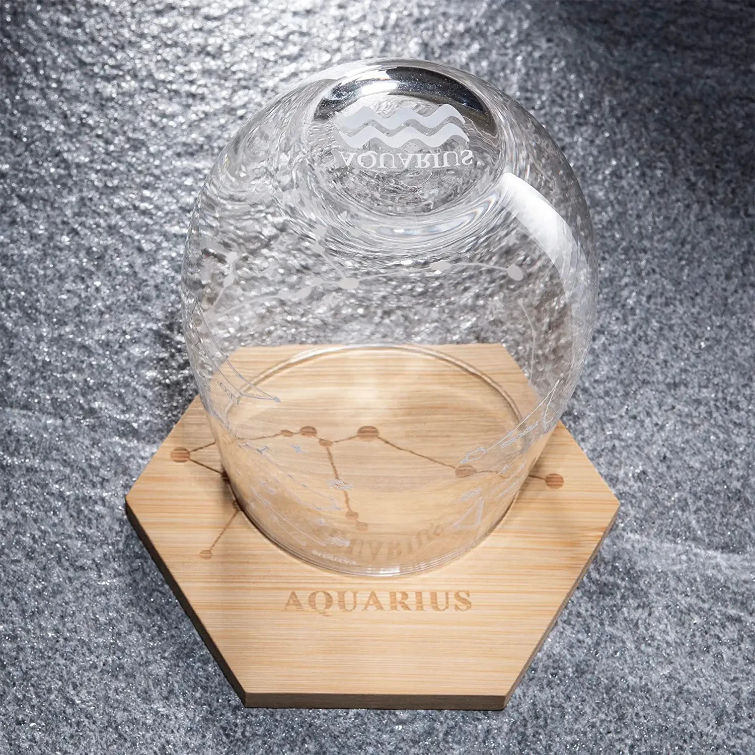 - These Zodiac Sign Glasses come with two matching sign coasters and are the ultimate party favors for your next constellation party, star-gazing gathering, or just to keep around the house! Celebrate your birth sign with this unique gift set that includes two etched constellation wine glasses and matching coasters made from mahogany wood. Each glass is etched with a different sign. These make amazing gifts for those who love astronomy, astrology, star gazing, or just decor accessories!