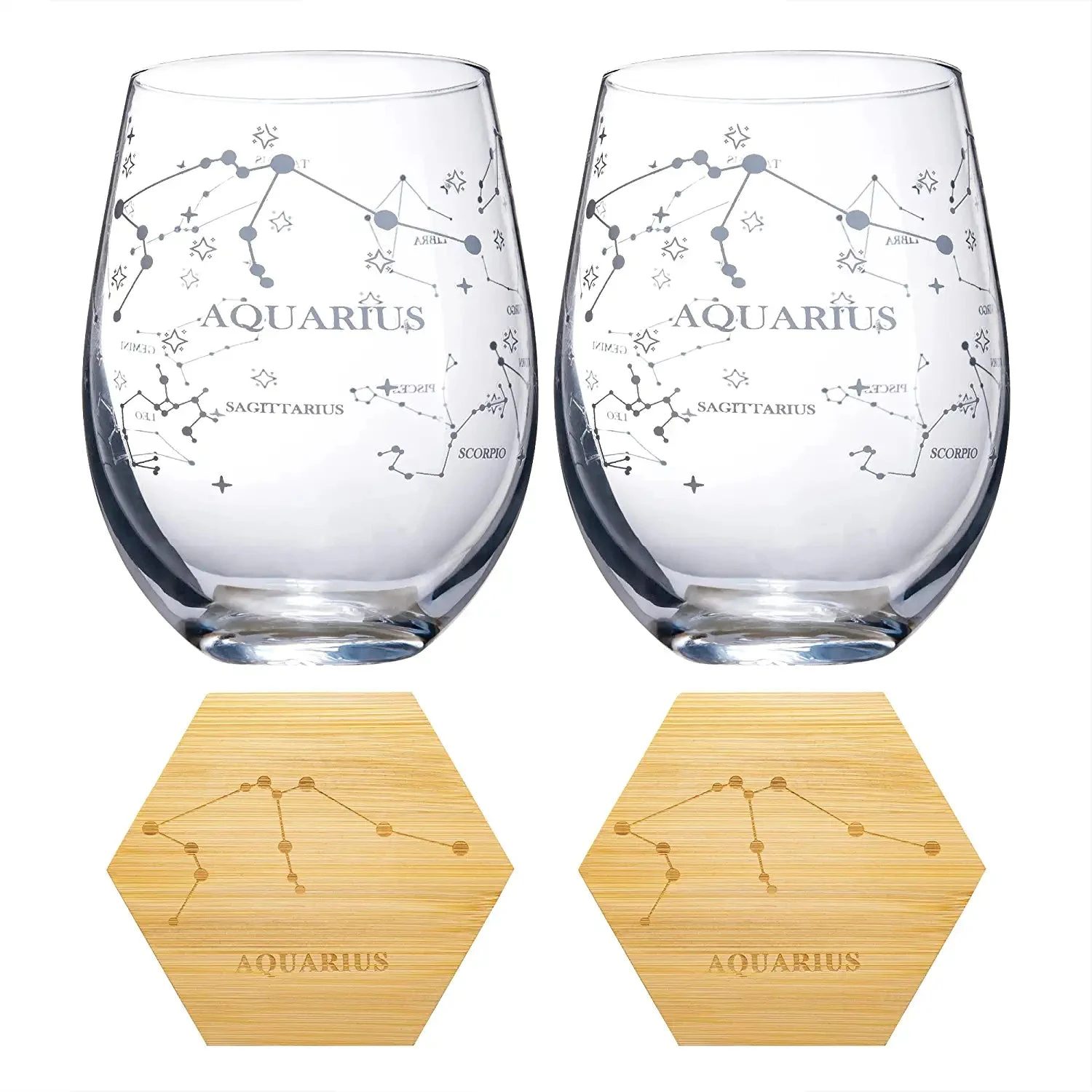 Set Of 2 Zodiac Sign Wine Glasses With 2 Wooden Coasters By The Wine Savant – Astrology Drinking Glass Set With Etched Constellation Tumblers For Juice, Water Home Bar Horoscope Gifts 18oz (Aquarius)