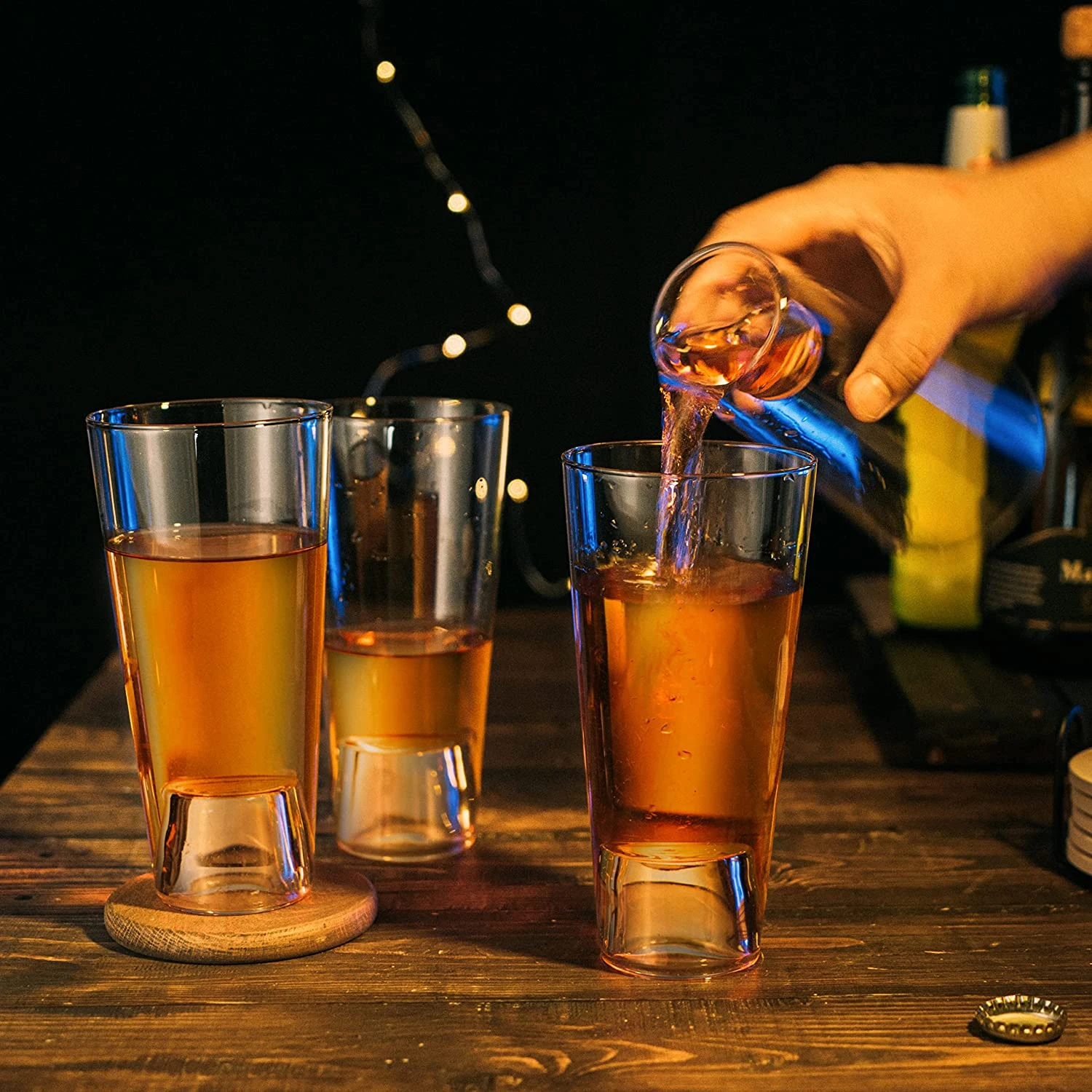 - Bring a touch of the high life to your home bar, wedding reception, or backyard bash with this pack of four double duty shot and beer pint glasses. Each glass has a high-shine finish that is perfect for entertaining. Turn the glass upside down to take a shot! Create a sophisticated and stylish bar cart with this Double Duty Drinking Glass Set. Ideal for parties and weddings, these tall 7″ glasses feature an upside down shot glass on the bottom for added versatility.
