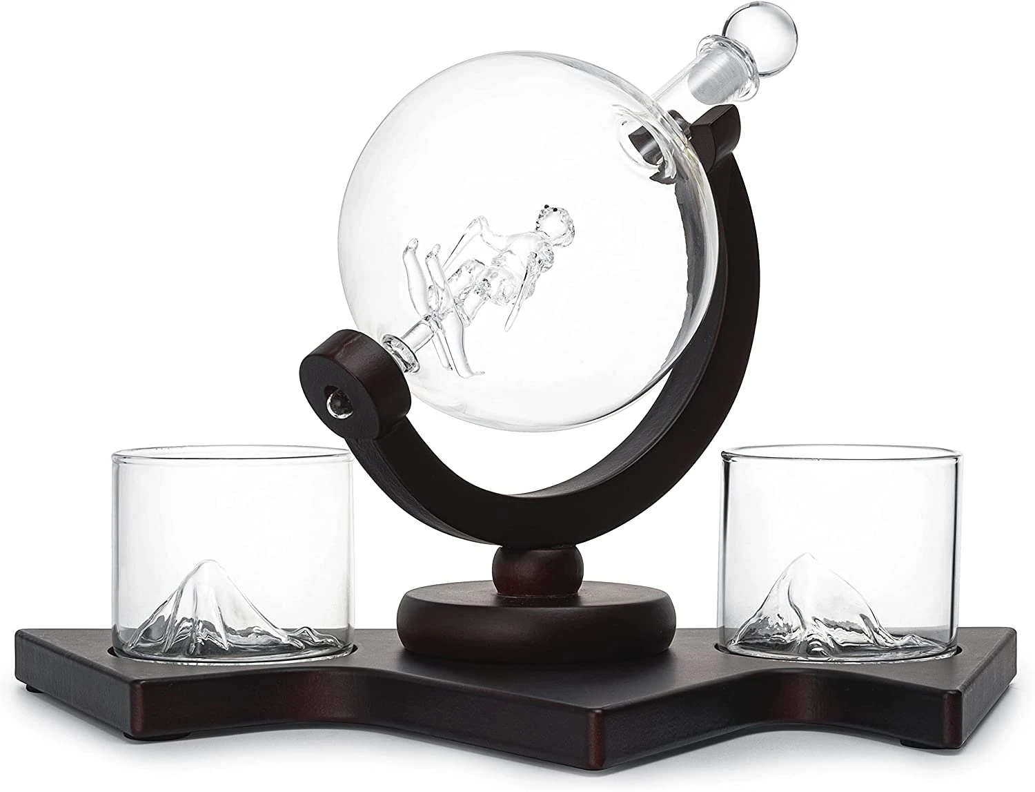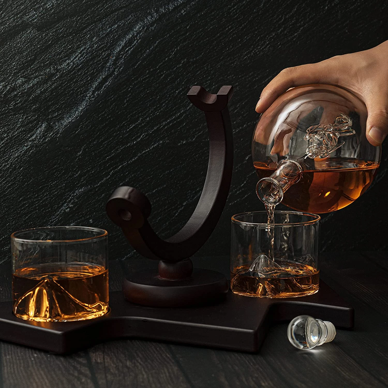 - How will you serve your favorite spirits this season? Hit the slopes in style and impress guests at your next ski party with the elegant Ski decanter set. This innovative 850 ml wine vessel features an expressive skier on the slopes creating the illusion of movement, two 12 oz glasses depicting a glacier, and an 14″ elegant mahogany wooden base. Be the life of the party and be the envy of your ski runs with this unique decanter set!