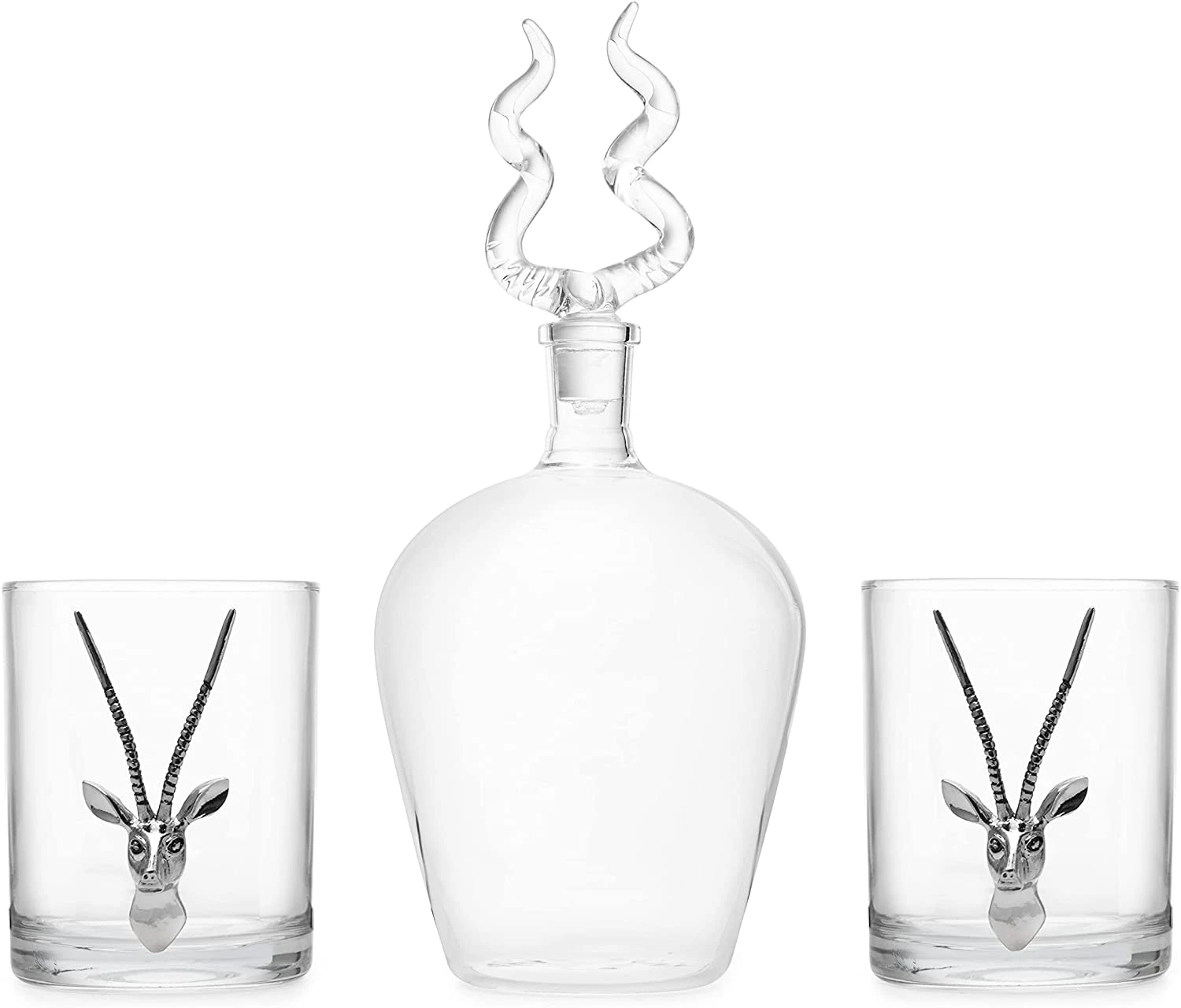 - Inspire the spirit of the outdoors with the Antler Decanter Set. This decorative, 25 oz decanter measures at 8.5″ in height, 5.5″ in width at the top, and has a 3.5″ base. A touchable glass antler stopper and two 12 oz stag antler glasses. Each glass has been decorated showcasing the beauty of wild animals on each glass. Its slender neck holds a replaceable stopper topped with antlers, while the elegant deer adorn every glass. Rare, eye-catching, designed in high end quality!