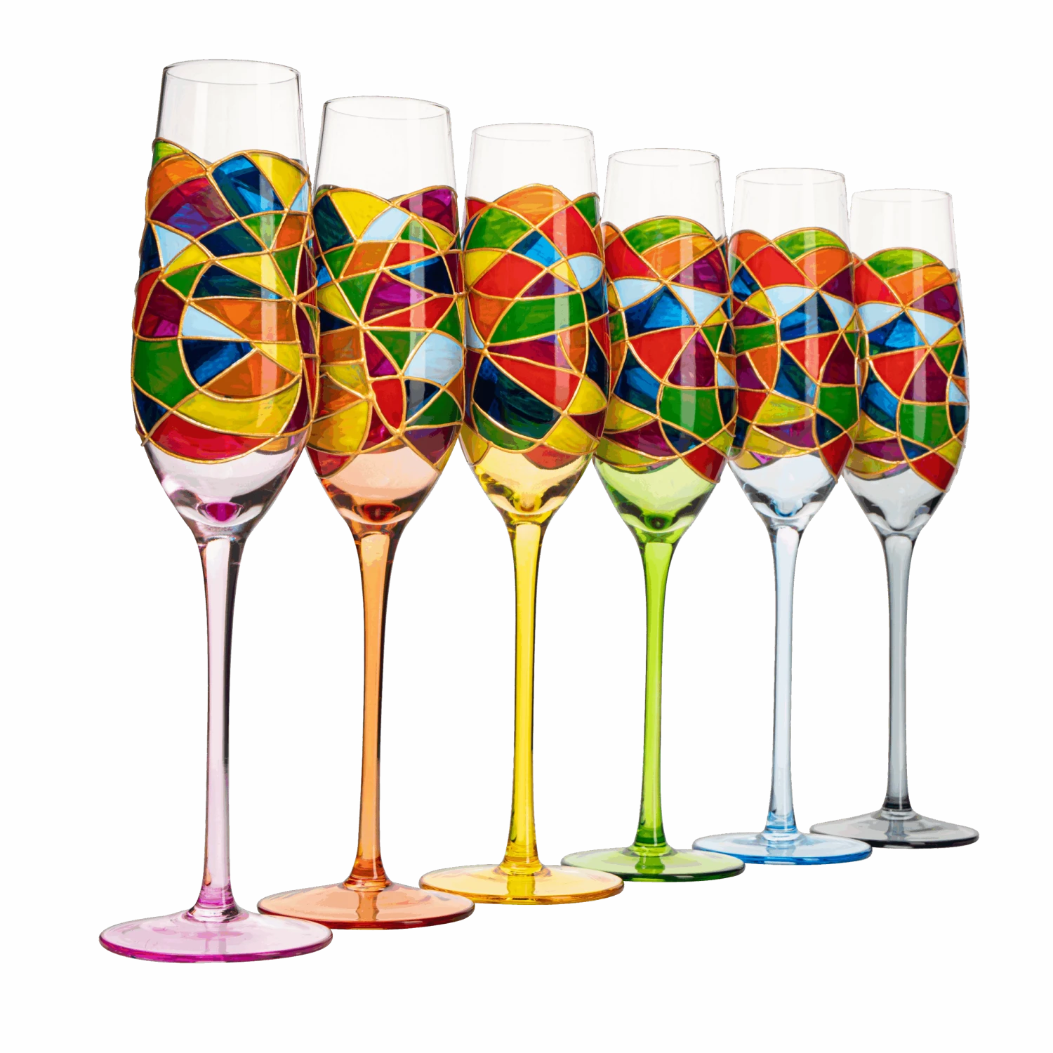 - The Wine Savant brings a little bit of color into your soiree’s with the Stained Glass Champagne Flute Set of 6. The combination of an elegant shape and vibrant stained glass design makes for a functional, fun piece for all bubbly lovers to enjoy. The vibrant colors reflect against the intricate high quality colored glass and truly creates a work of art for your morning coffee. A beautiful Italian Renaissance inspired gift for the connoisseur, friends or a family member that is fascinated by art