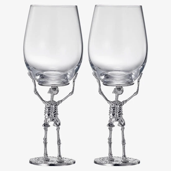 - It’s a ghoulish good time always with our Stemmed Skeleton wine glasses! A must have for Halloween or any time of the year you want to celebrate the macabre. Be a little more frightening at your next dinner party! This spooky wine glass set is a great gift for any wine lover! Perfect for Halloween and beyond, the design of this two-piece set recalls a vintage ossuary. Scare the heck out of your guests while they enjoy their favorite vino.