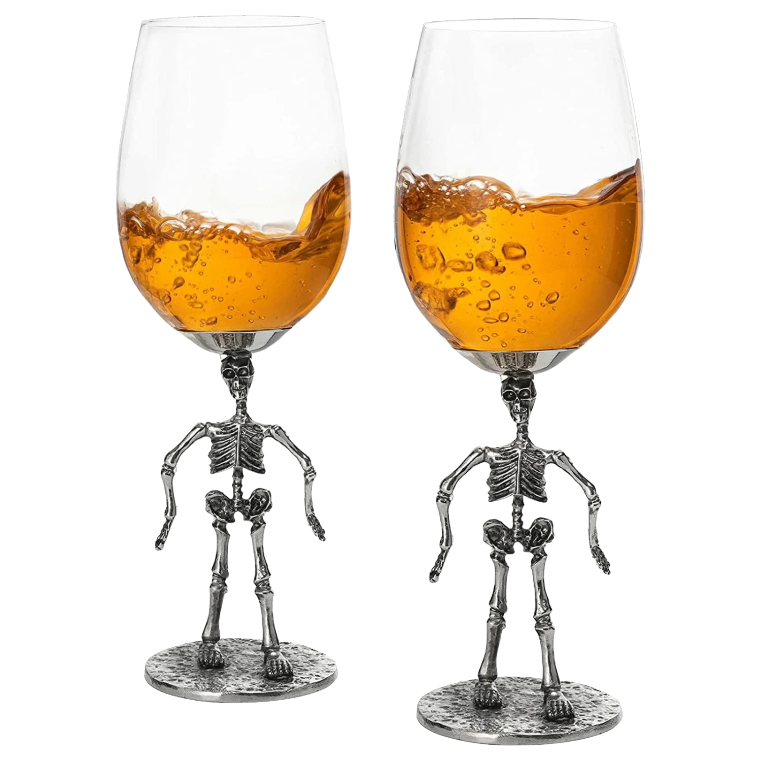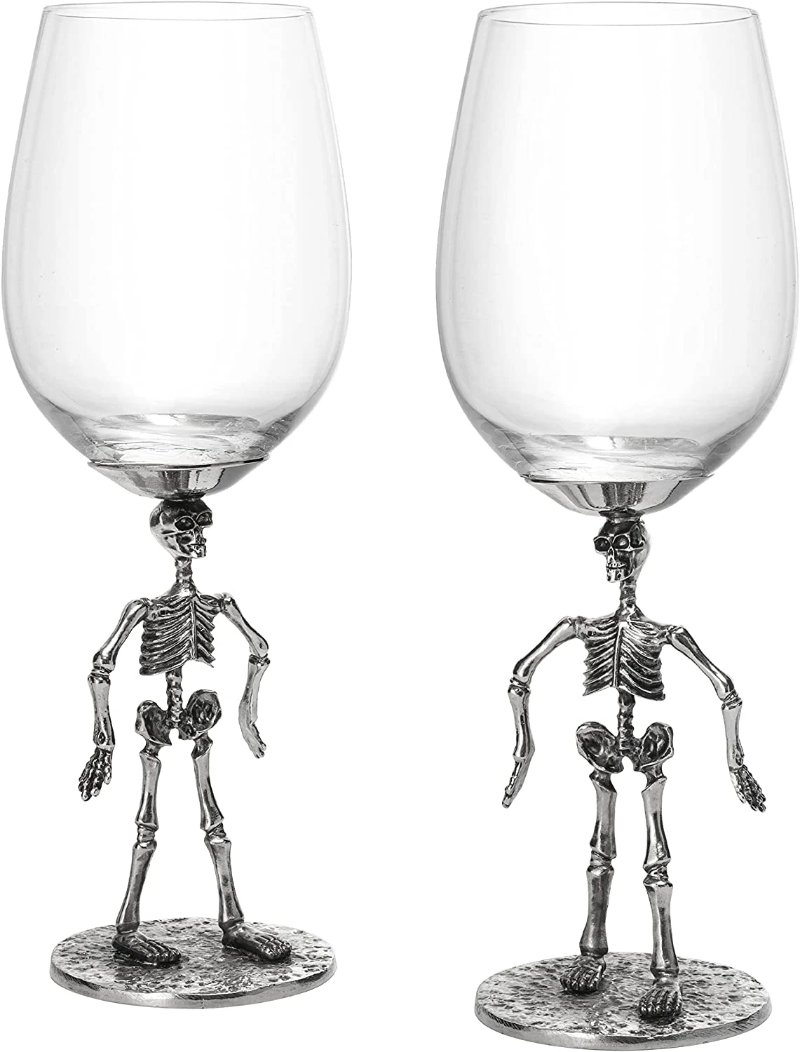 - It’s a ghoulish good time always with our Stemmed Skeleton wine glasses! A must have for Halloween or any time of the year you want to celebrate the macabre. Be a little more frightening at your next dinner party! This spooky wine glass set is a great gift for any wine lover! Perfect for Halloween and beyond, the design of this two-piece set recalls a vintage ossuary. Scare the heck out of your guests while they enjoy their favorite vino.