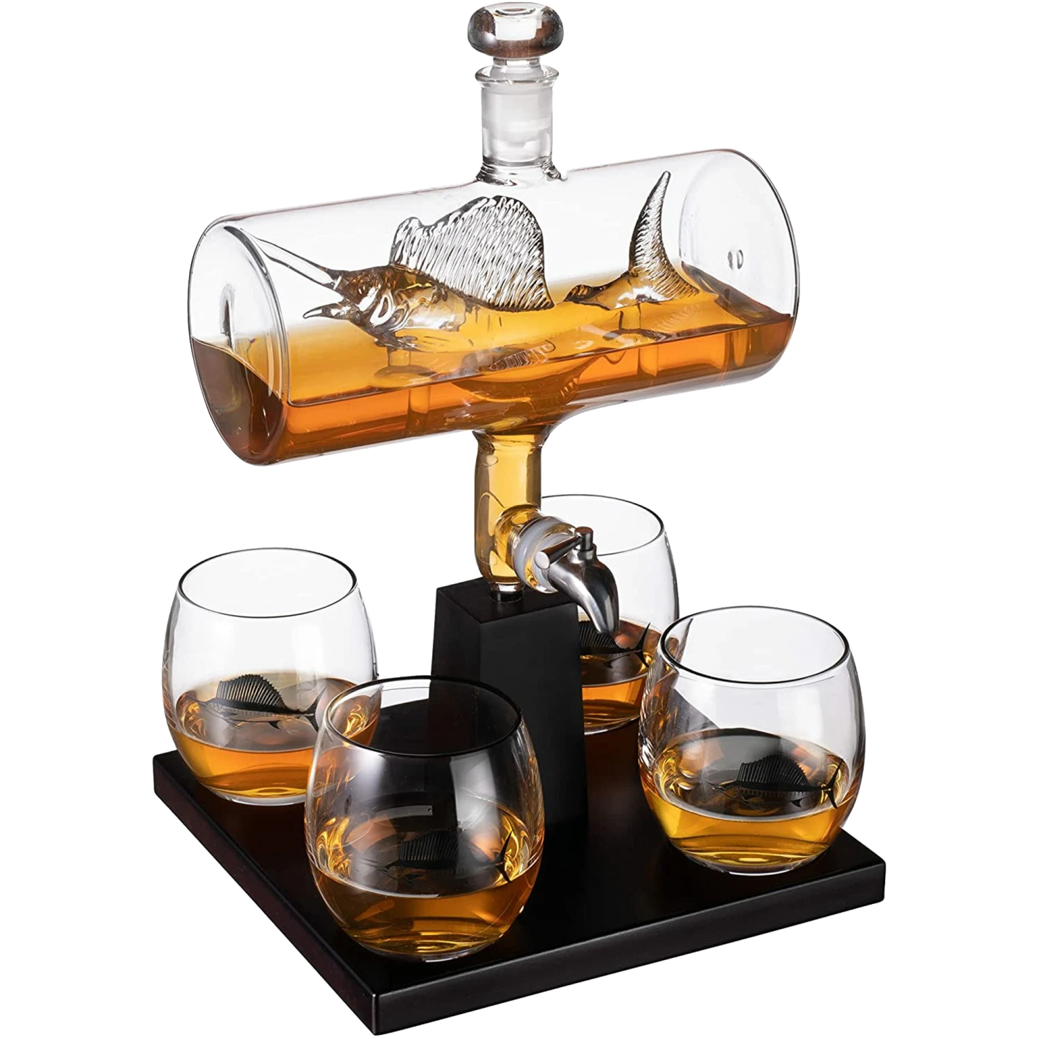 Swordfish & Sailfish Wine &Whiskey Decanter Dispenser And 4 Liquor Glasses – Fishing & Boat Decanter & Glass Set – Fishing Gifts For Men Bourbon & Scotch Decanter For Alcohol – Fisherman Gifts For Dad