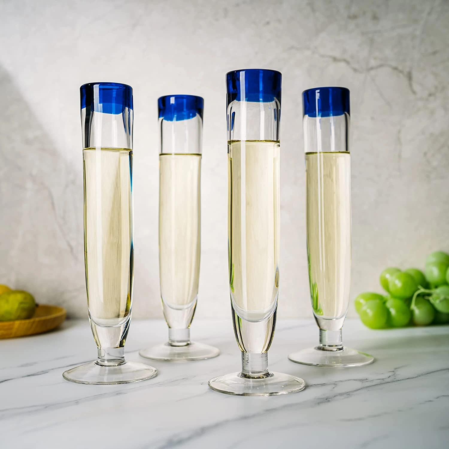- This hand-blown cobalt blue rim champagne flute set of four is the perfect addition to your home bar or event, it will bring the class and style you need. They have a unique look with a classic style that makes a great gift or wedding favor. Our cobalt blue-rim champagne flutes are the perfect accent for any party table. Perfect for champagne, prosecco, and other drinks as they can also mix well with most liquors and juices.