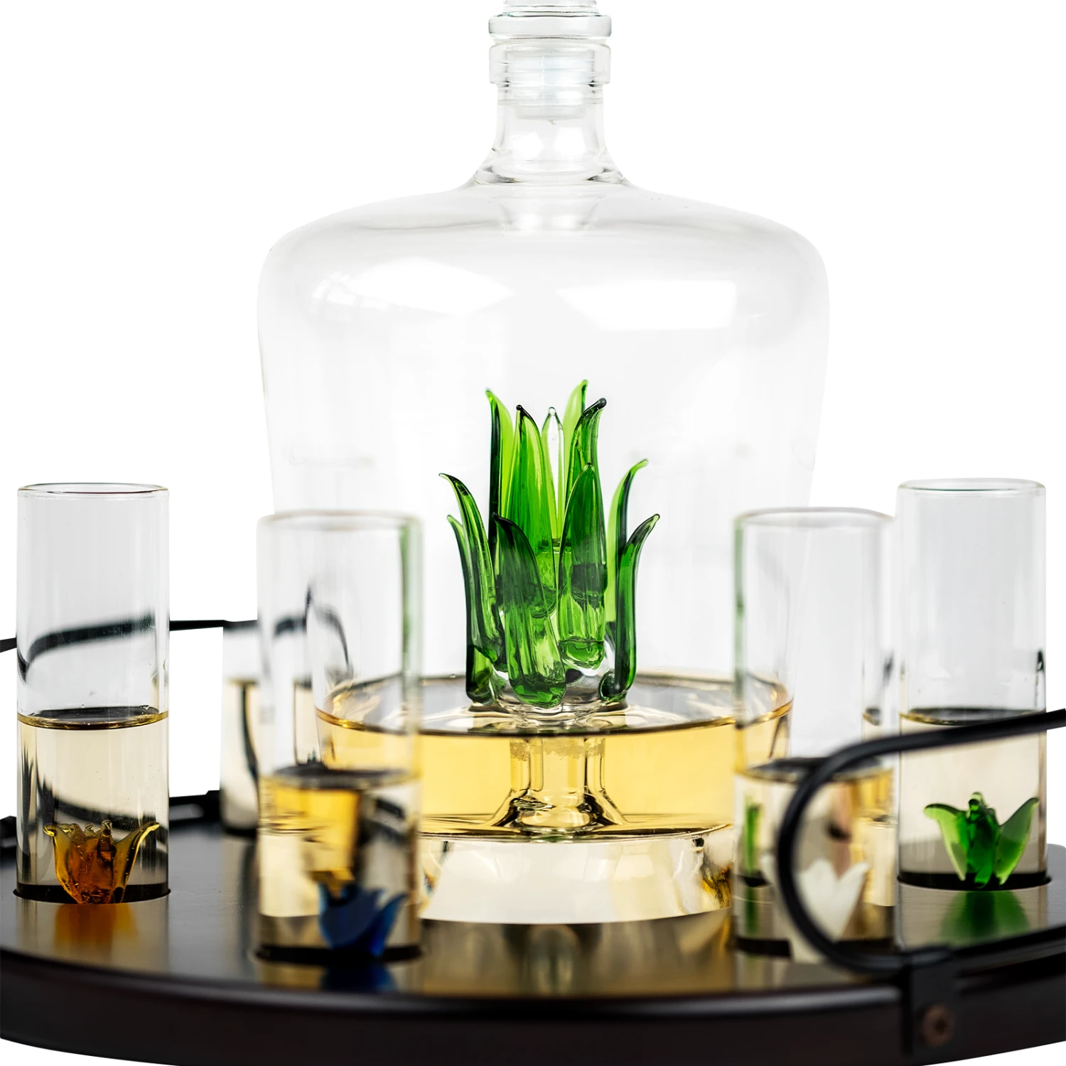 - BEAUTIFUL AGAVE DECANTER AND SHOT GLASSES: The hand crafted glass agave plant displays the Tequila plant with 6 agave shot glasses are a beautiful match, pair with your favorite Tequila scotch, whiskey, wine or port