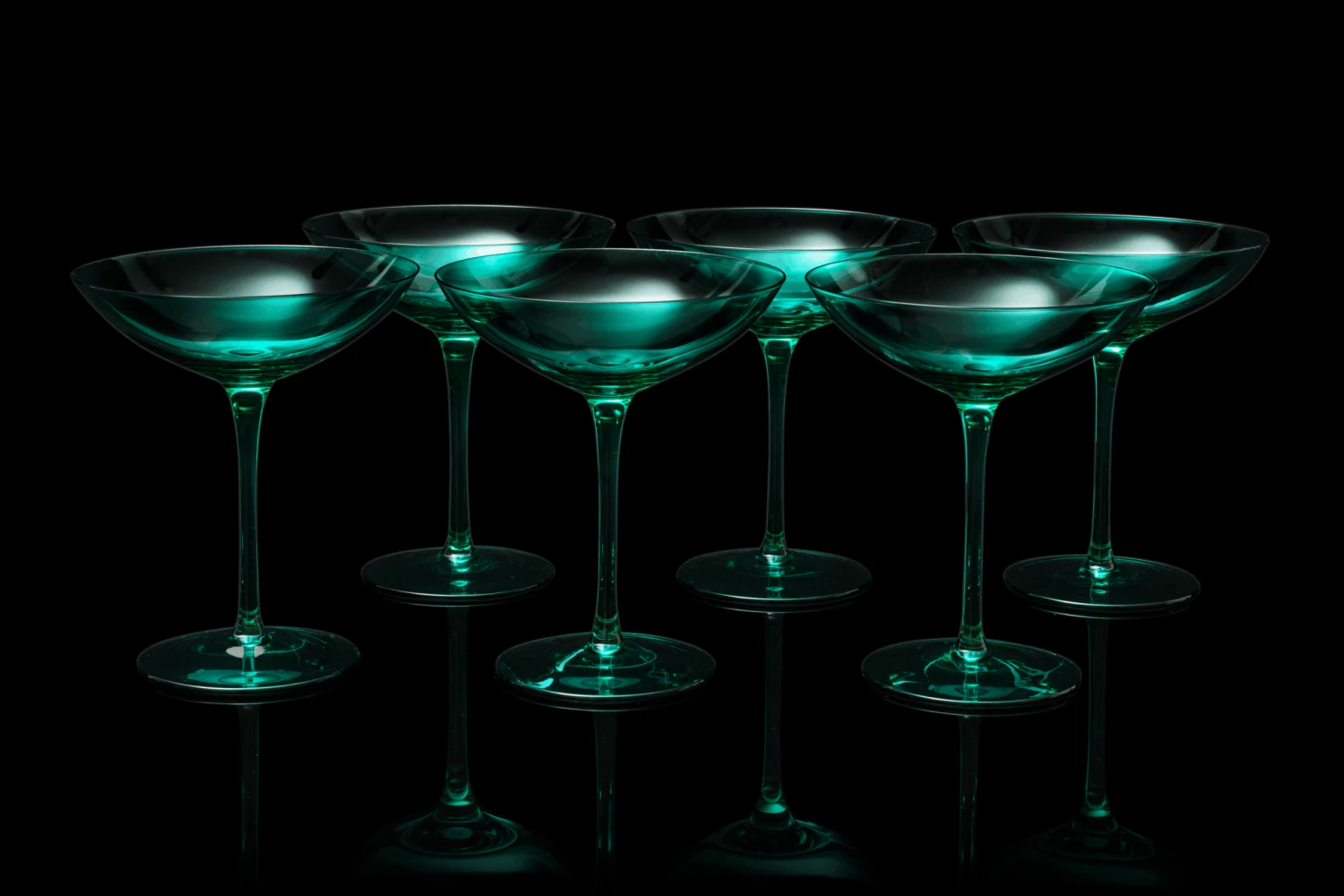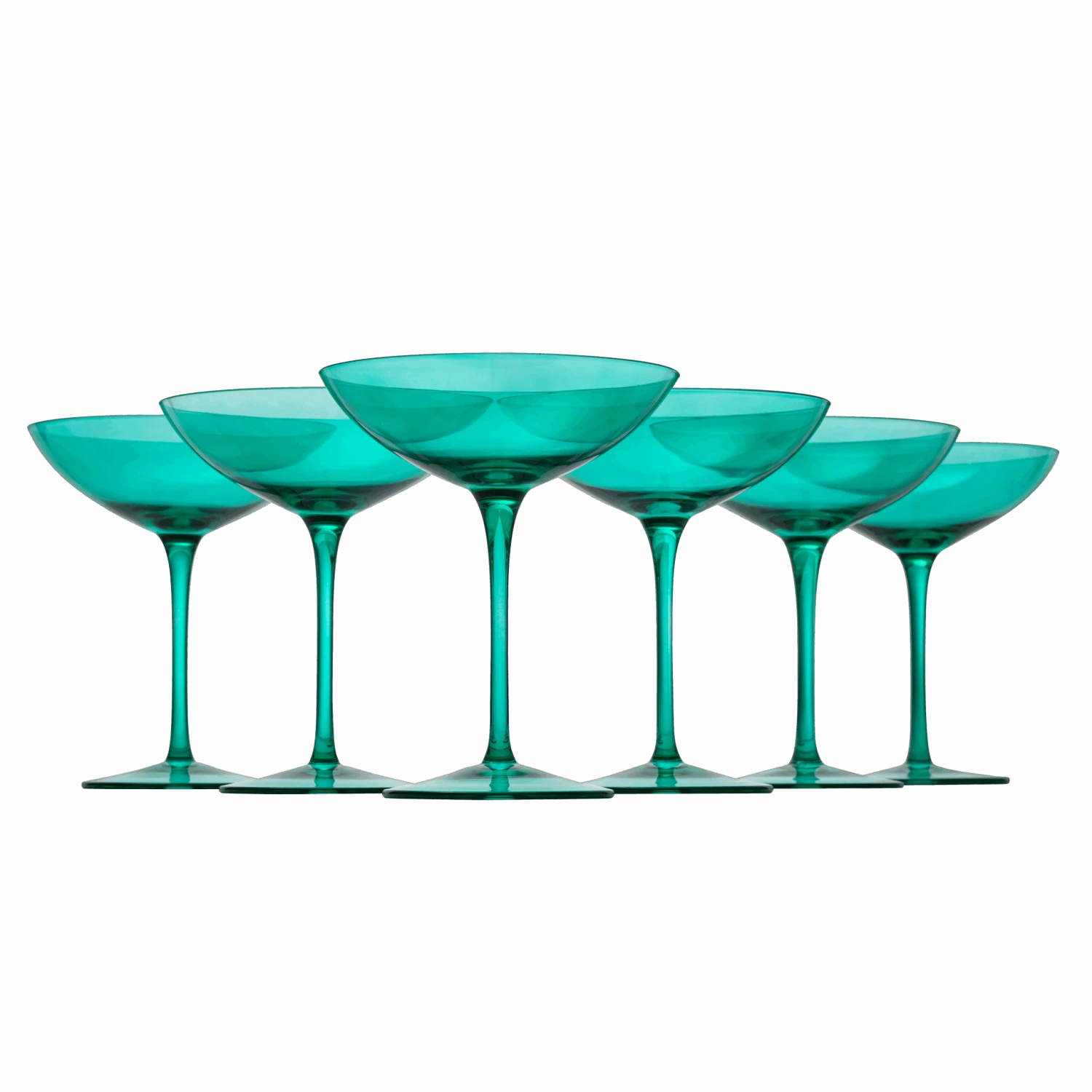 - Sip your bubbly in style with this set of six champagne coupes that differ in color and are sure to enhance any celebration. This sparkling set of six colorful champagne coupes will add a festive touch to any party. Make a toast with a touch of elegance with these Champagne coupes and add a touch of glamour to any occasion. These champagne coupes have been skillfully crafted and shaped and ready to be enjoyed.