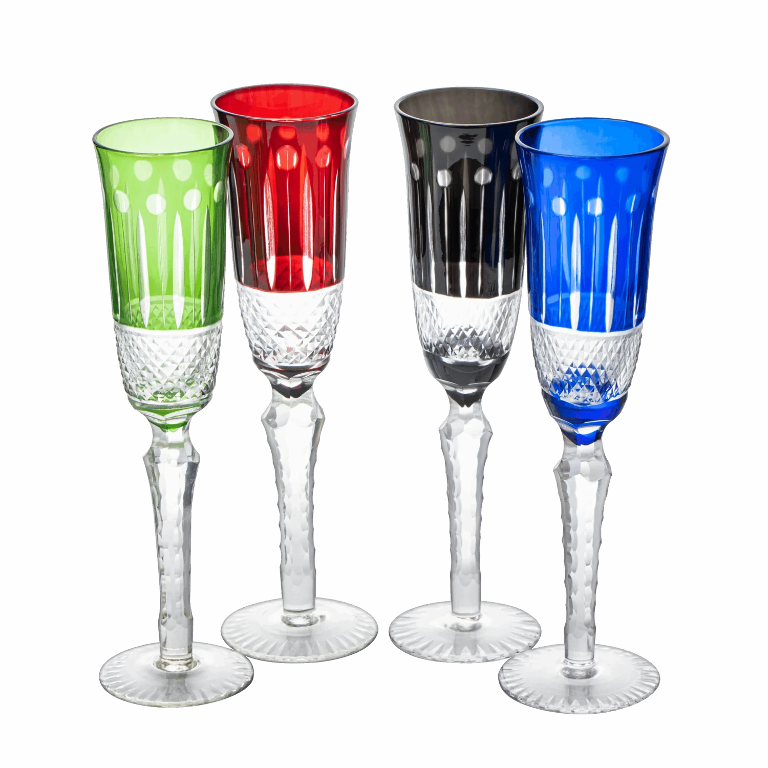 - Bring a modern, colorful, and elegant touch to your interior with these handblown and hand-cut champagne glasses. The rich colors allow for a sparkling and joyful touch to any occasion. This set of colored glasses are known for their elegance and inimitable style and come with red, blue, green, and black colored glasses. This luxurious set is sophisticated and elegant yet subtle enough to be paired with any styles.