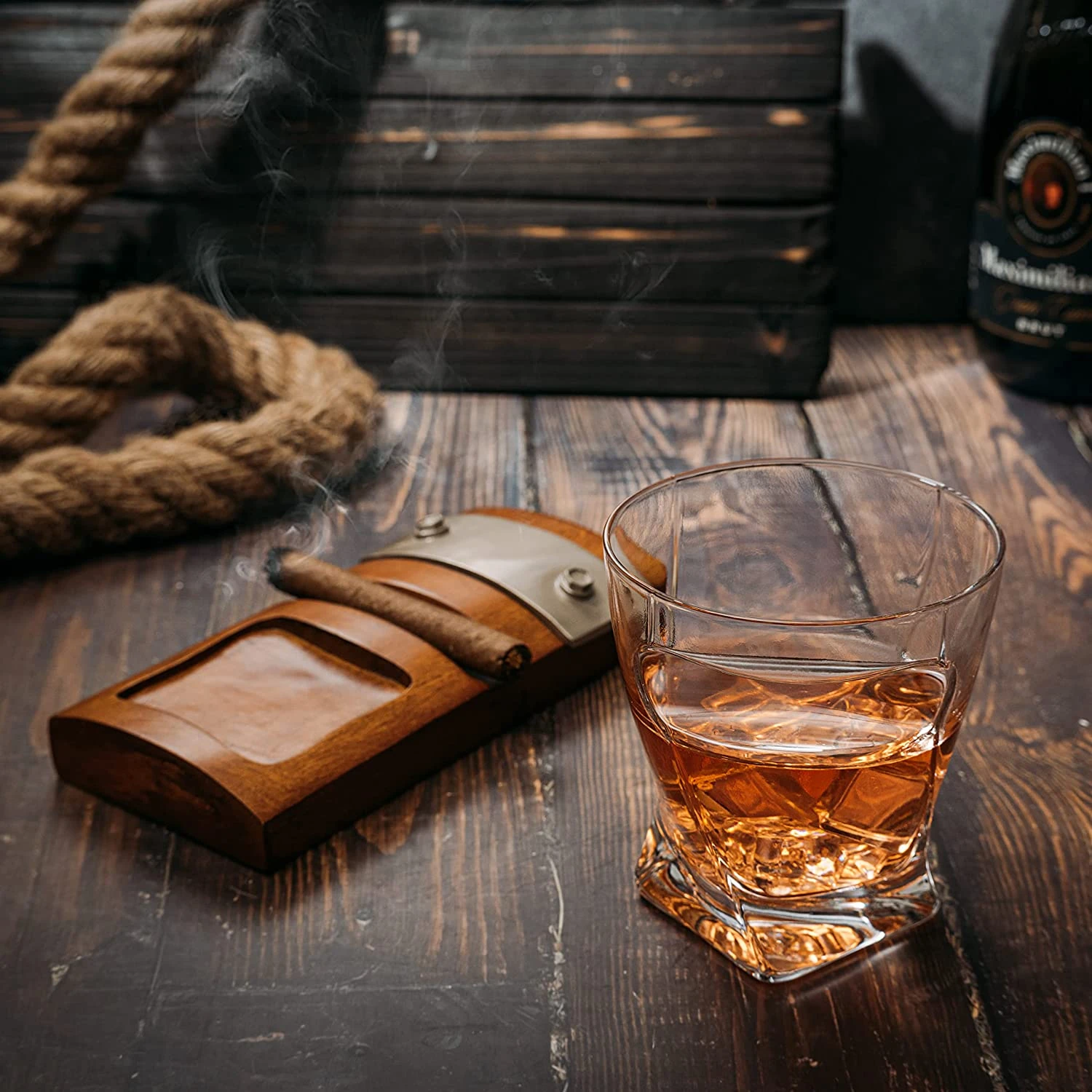 - Enhance your drinking and smoking experience with twisted glasses set all atop an elegant wooden base.