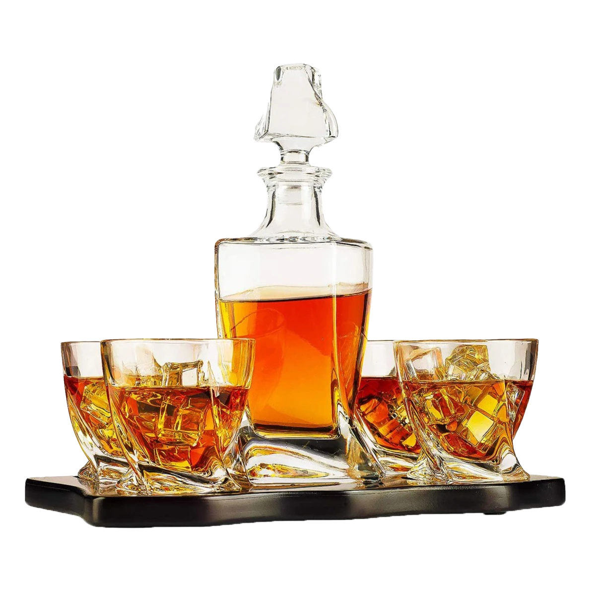 - BEAUTIFUL DECANTER SET ON WOOD HOLDING TRAY: This set of the hand carved Twisted Spiral Glacier Shaped Decanter and glasses, are part of The Wine Savant limited edition decanters and sets