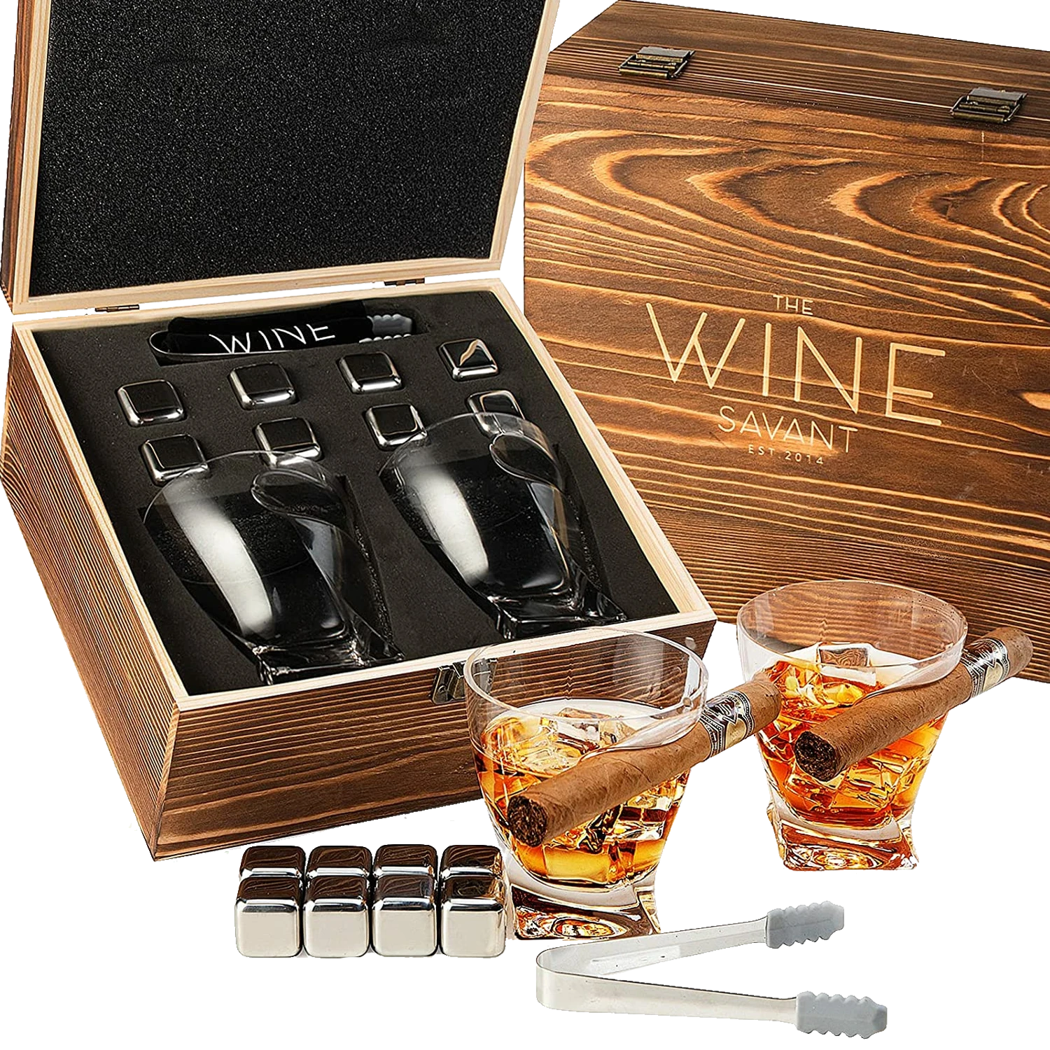 The Wine Savant Luxurious Cigar Glasses – Whiskey Glass With Cigar Holder – Set Of 2, 10oz Cigar Holder Whiskey Glasses, Tongs, 8 Cube Chilling Rocks Stones – Set In Premium Wood Box Gift For Any Bar