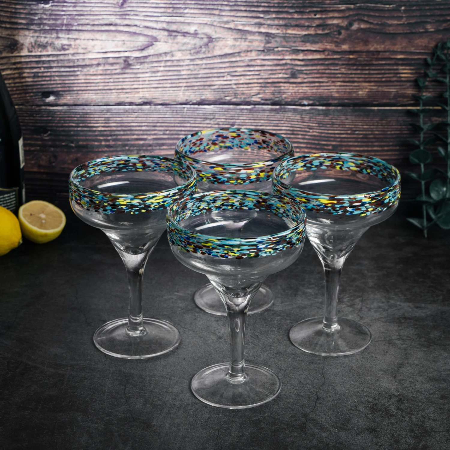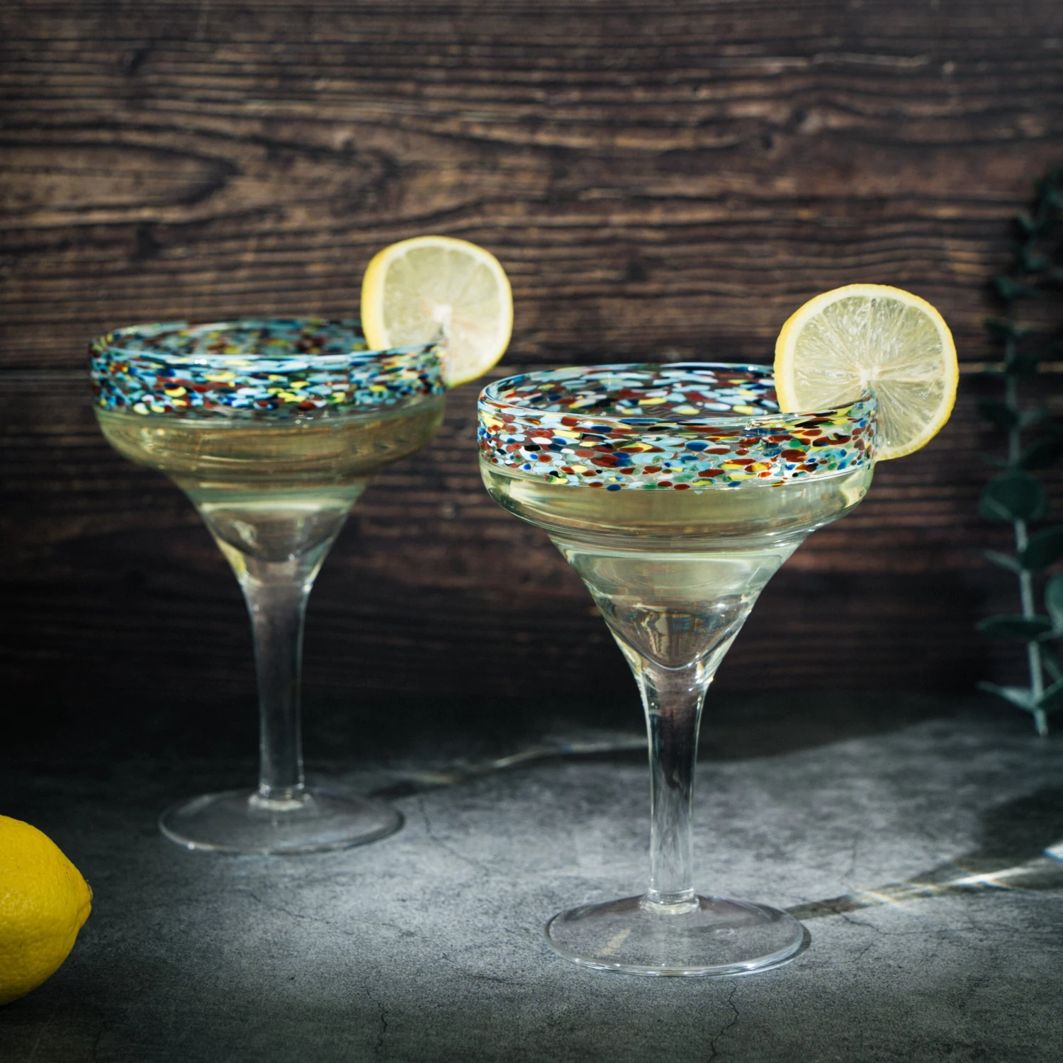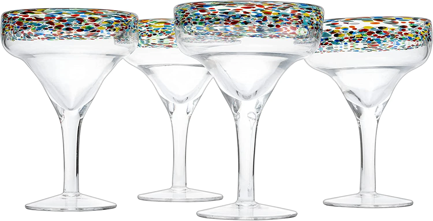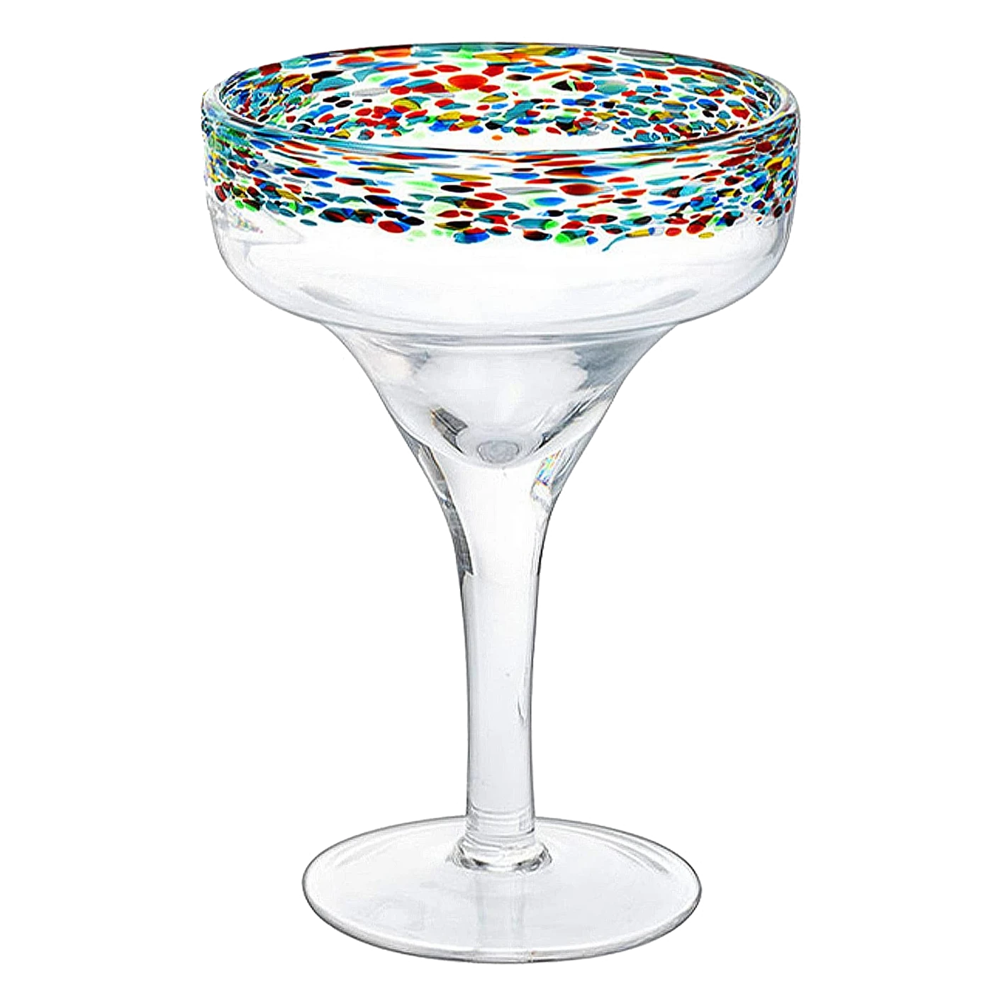 - These hand-blown, colorful glasses feature a timeless confetti design. Handcrafted by skilled artisans, these margarita glasses will be a true conversation starter.