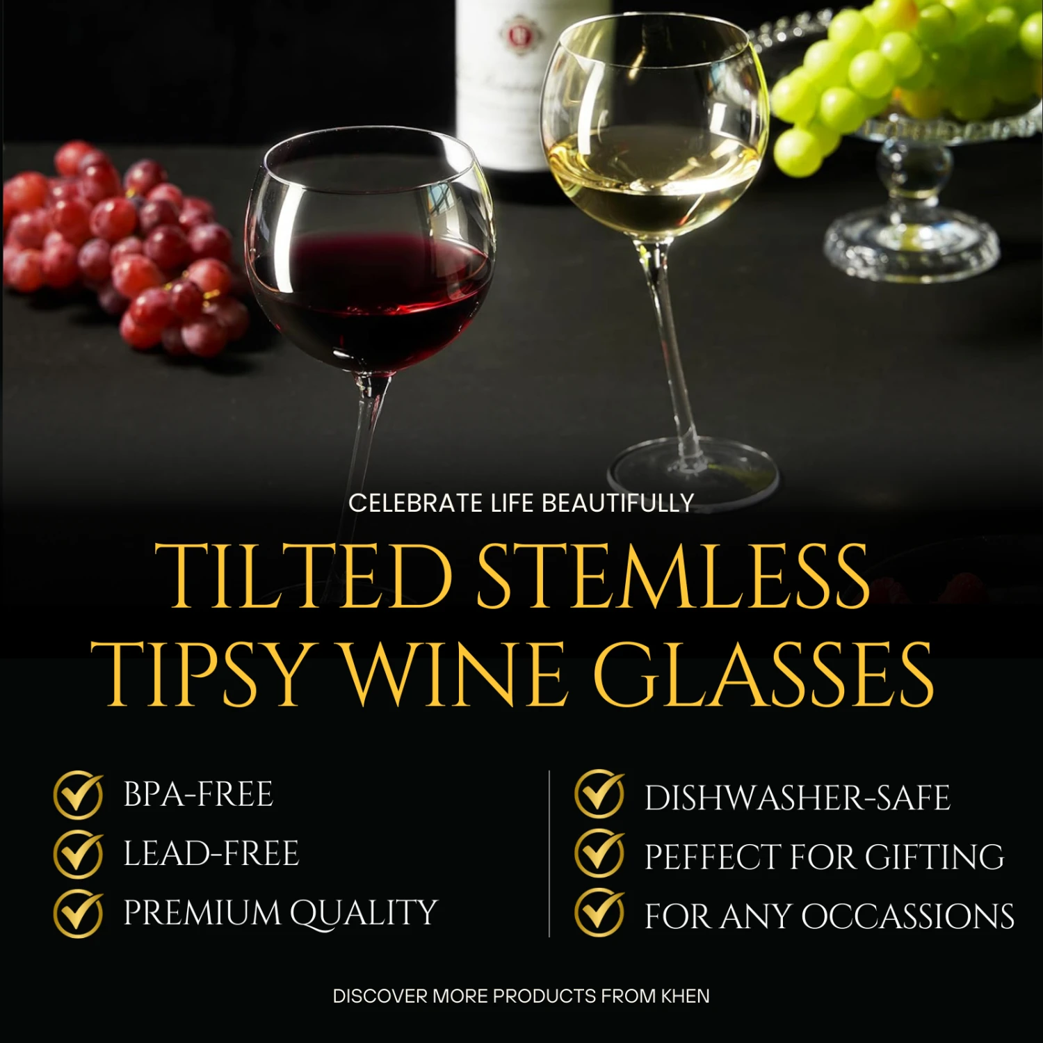 - Introducing the Tipsy Wine Glasses Set of 2, a unique and playful addition to your drinkware collection. With a capacity of 15.5 oz, these tilted stemless wine glasses are perfect for enjoying your favorite red or white wine. Their eye-catching, tilted design is sure to be a conversation starter at any gathering, adding a fun twist to your wine-tasting experience. Whether you’re hosting a casual get-together or celebrating a special occasion, these glasses will elevate the mood and bring laughter to your table.