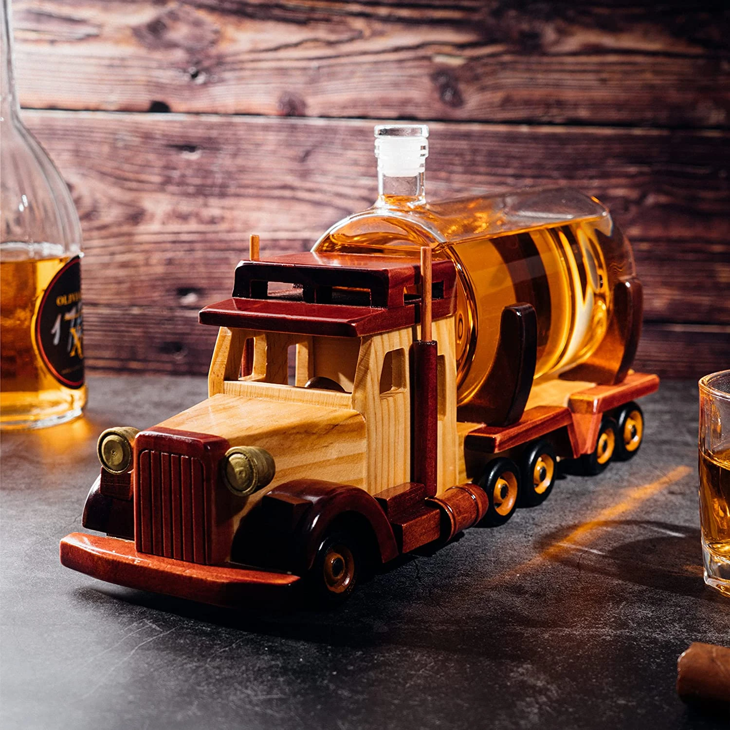 - A must have for every trucker, construction worker or even just for casual collectors! The wooden body is accented with intricate details, and encases a hand-blown glass whiskey decanter in a barrel shape that holds a full 1000ml ounces of your favorite spirit. Carry this gorgeous wooden truck, made with European styling, around your home and dispense whiskey into your glass. The barrel-shaped decanter adds instant class to any whiskey connoisseur’s home bar.