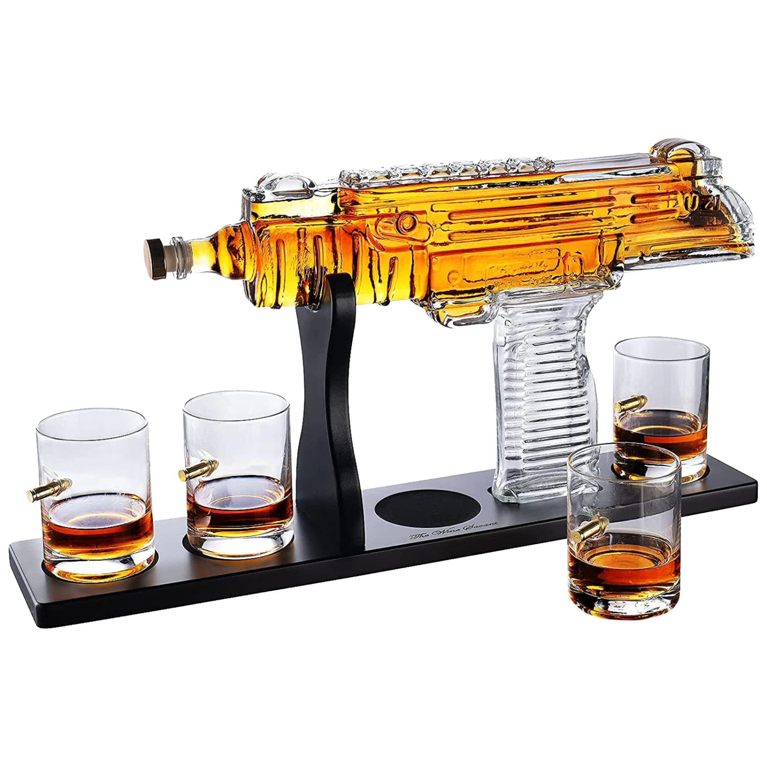 - UZI WHISKEY DECANTER SET – Display your fine spirits in the imposing shape and authentic outline of a real Uzi submachine gun with our whiskey decanter sets that include four 12 oz glass tumblers plus a mahogany base for impressive and functional display.