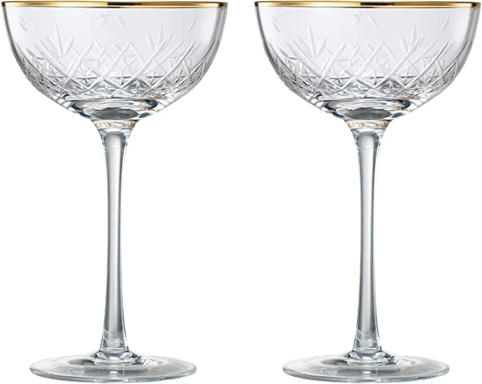 - The Vintage Inspired Art Deco Crystal Coupes with a Gold Rim are a must-have addition to any home bar. Sold as a set of two, each glass is a twist on the traditional cocktail glass. The glasses have a unique and elegant design that sets them apart from other glassware collections. The coupes hold 8 ounces of liquid, making them perfect for cocktails.