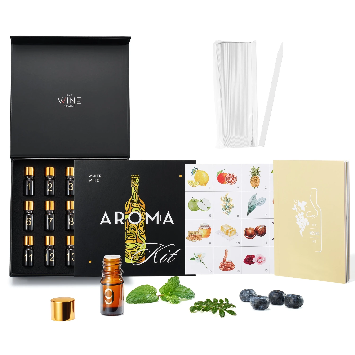 - Introducing the White Wine Aroma Kit, the ultimate educational tool for enhancing your understanding of white wines. This comprehensive tasting and smelling set is designed to help both beginners and seasoned sommeliers develop their ability to identify and appreciate the aromas commonly found in white wines. With 15 distinct aromas included, this kit is perfect for refining your senses and elevating your wine-tasting experience.