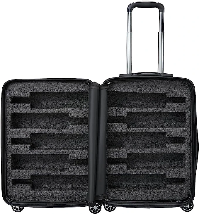 - The Wine Bottle Suitcase features 10 grooves, each perfectly sized to fit a standard wine bottle. The bottles are held securely in place, preventing any movement or potential damage during transit. With this suitcase, you can rest assured that your wine collection will arrive at your destination intact and ready to be enjoyed.