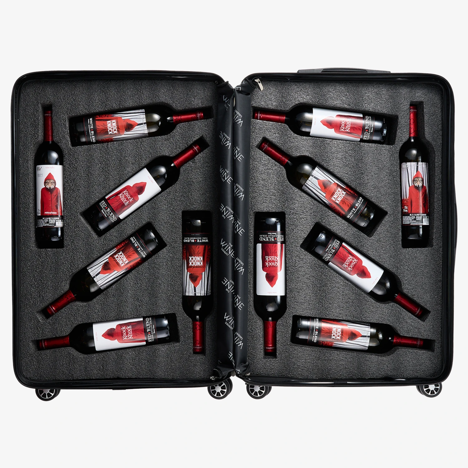 - Introducing the Wine Bottle Suitcase, a must-have accessory for wine lovers and connoisseurs on the go. This unique suitcase is designed to securely transport up to 12 standard 750 mL wine bottles, ensuring that you can bring your favorite vintages with you wherever you travel. Say goodbye to worrying about wine bottles breaking or spilling in your luggage.